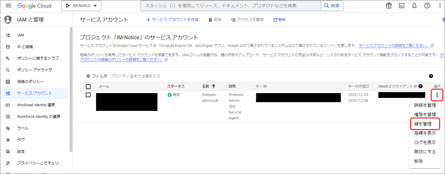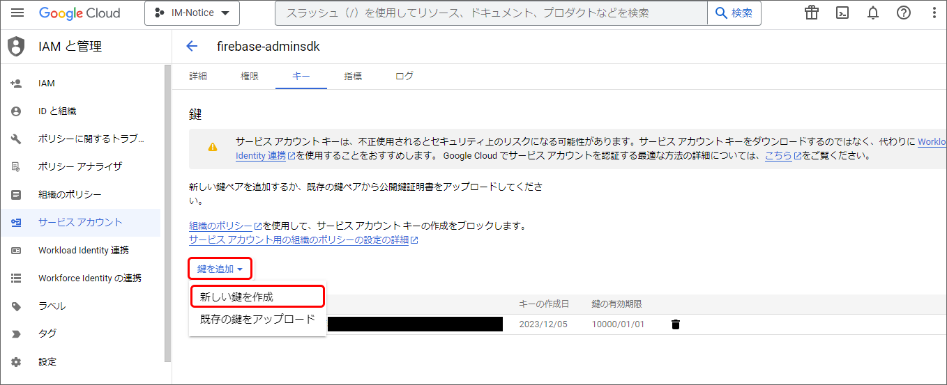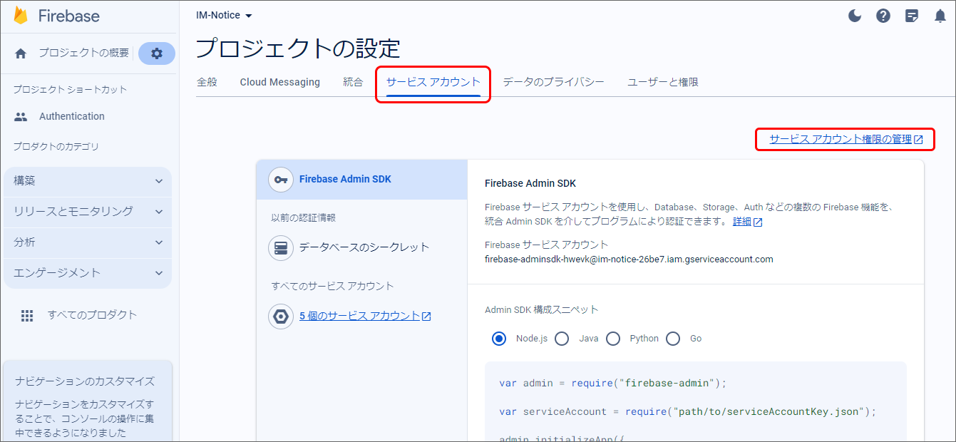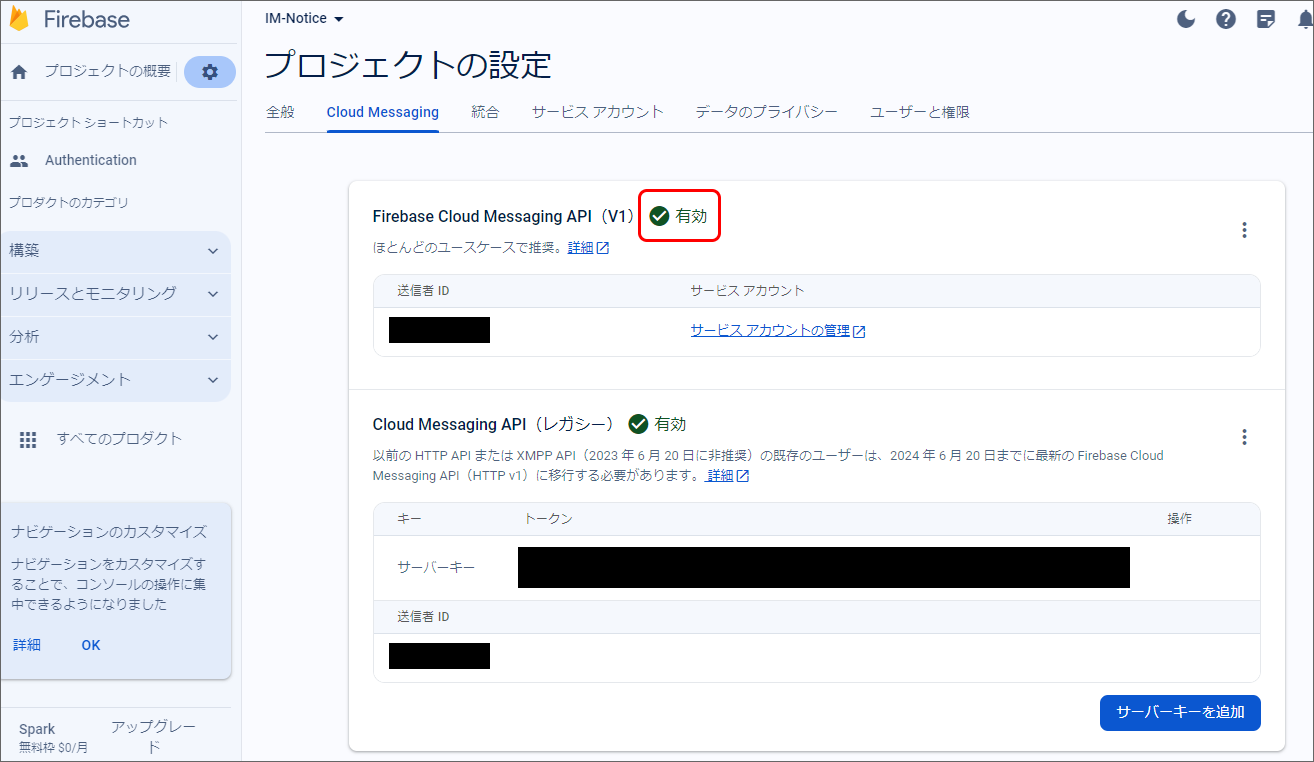 Firebase Console にログインしてください。 対象のプロジェクトをクリックしてください。 プロジェクト概要の歯車アイコンをクリックし、「プロジェクトを設定」をクリックしてください。 「Cloud Messaging」タブをクリックし、Firebase Cloud Messaging API(V1)が有効であることを確認してください。無効だった場合は有効にしてください。 「サービスアカウント」タブを選択し、「新しい秘密鍵を生成」をクリックしてください。 表示されたメッセージを確認し、「キー生成」をクリックしてください。秘密鍵が生成されると、JSON 形式のサービスアカウントの認証情報ファイルがダウンロードされます。設定ファイルを編集する際に、設定ファイルと同じディレクトリに配置する必要がありますので、保持しておいてください。 IM-Juggling の <(プロジェクト名)/conf> 配下に出力された im-notice-mobile-config.xml を開き、<server-key> を削除して <credentials-file> を追加してください。<credentials-file> には、ダウンロードした JSON 形式のサービスアカウント認証情報ファイルのファイル名を設定してください。認証情報ファイルを im-notice-mobile-config.xml と同じディレクトリに配置してください。また、<url> には https://fcm.googleapis.com/v1/projects/%REPLACE_WITH_PROJECT_ID%/messages:send を設定してください。ただし、%REPLACE_WITH_PROJECT_ID% はFirebaseプロジェクトのプロジェクトIDに置き換えて設定してください。<fcm name="fcm"> <url>https://fcm.googleapis.com/v1/projects/xxxxxxxxxxxx/messages:send</url> <project-id>xxxxxxxxxxxx</project-id> <application-id>xxxxxxxxxxxx</application-id> <api-key>xxxxxxxxxxxx</api-key> <!-- <server-key>xxxxxxxxxxxx</server-key> --> <credentials-file>xxxxxxxxxxxx.json</credentials-file> <sender-id>xxxxxxxxxxxx</sender-id> </fcm> WAR ファイルを出力して再デプロイすることで、FCM HTTP v1 API への移行が完了します。WAR ファイルの出力に関しては「WARファイルの出力」を、再デプロイに関しては「WARファイルの再デプロイ」を参照してください。