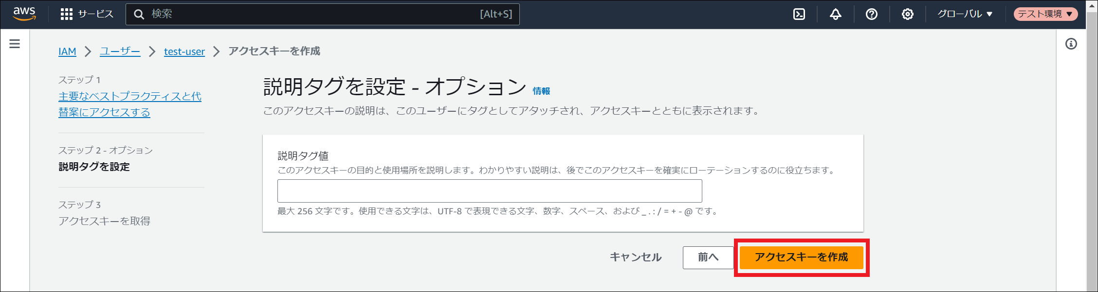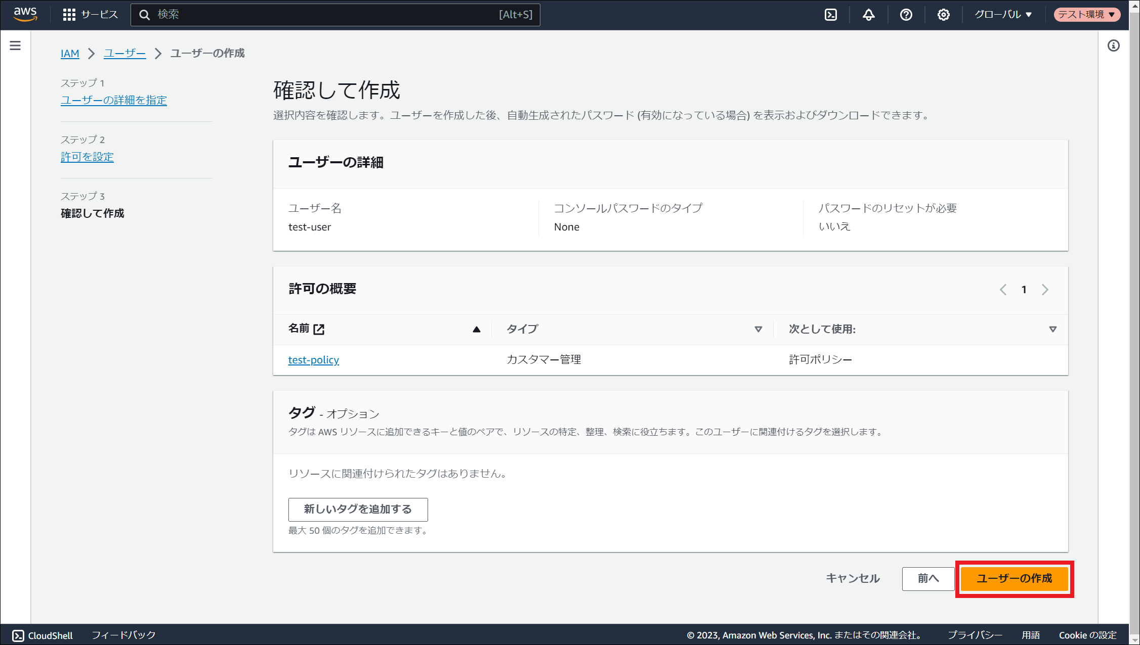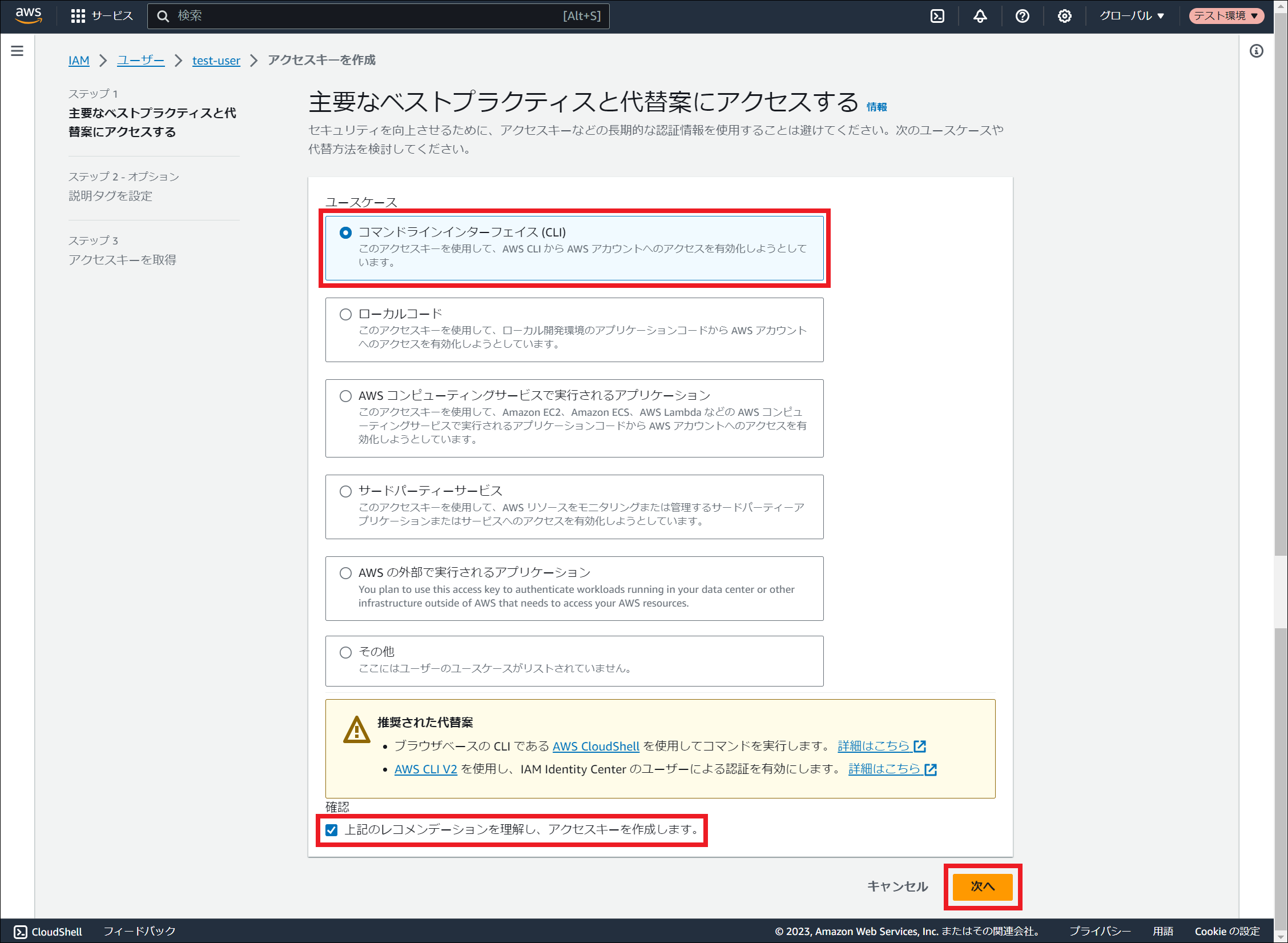 AWS Identity and Access Management (IAM) にサインインしてください。 「ユーザー」を選択し、「ユーザーの作成」を押下してください。 「ユーザー名」に任意のユーザー名を入力し、「次へ」を押下してください。 「許可のオプション」にて「ポリシーを直接アタッチする」を選択してください。その後、 ポリシーの作成 で作成したポリシー名にチェックを入れ、「次へ」を押下してください。 「ユーザーの作成」を押下してください。 作成したユーザー名を押下してください。 「セキュリティ認証情報」タブを押下し、「アクセスキー」にて「アクセスキーを作成」を押下してください。 「コマンドラインインターフェイス (CLI)」を選択し、「上記のレコメンデーションを理解し、アクセスキーを作成します。」にチェックを入れ、「次へ」を押下してください。 「アクセスキーを作成」を押下してください。 「アクセスキーを取得」画面でアクセスキーとシークレットアクセスキーを控えるか、「.csv ファイルをダウンロード」を押下してください。その後、「完了」を押下してください。
