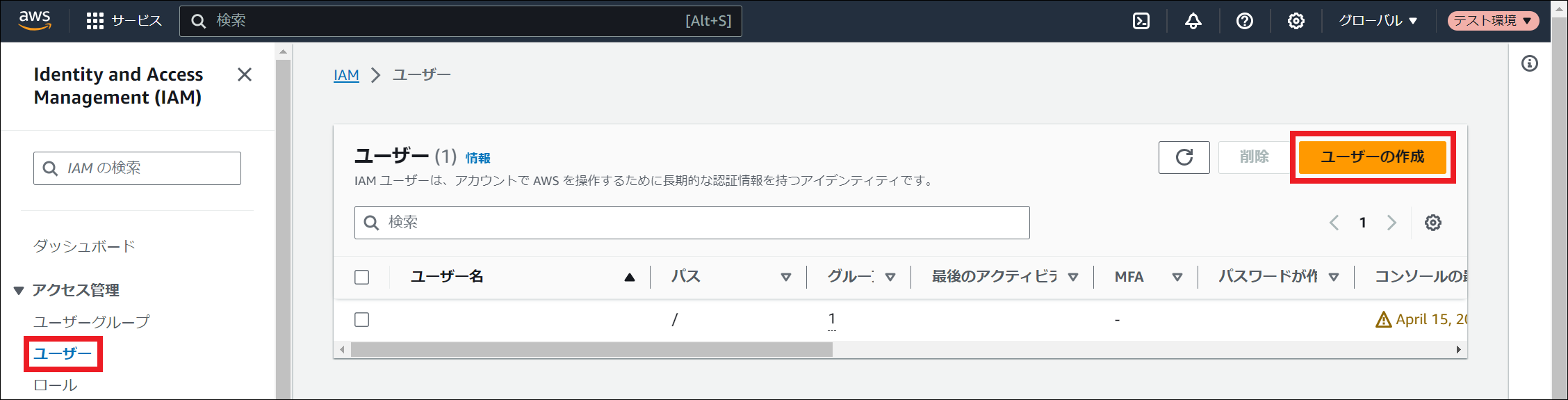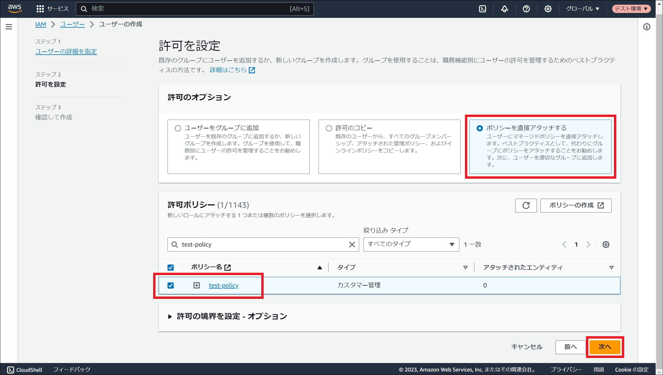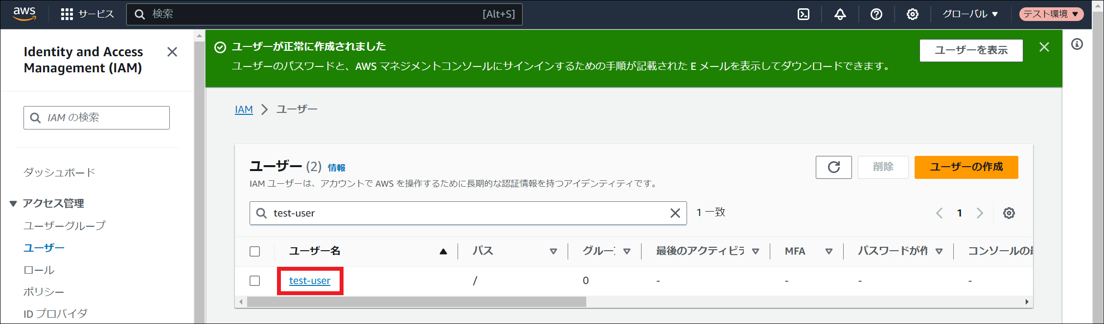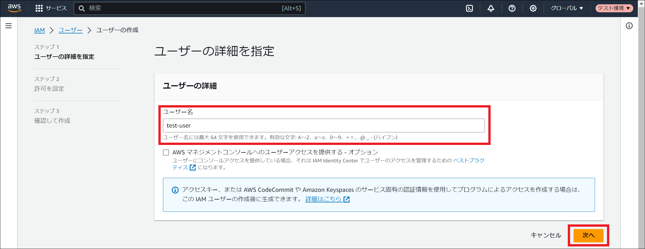 AWS Identity and Access Management (IAM) にサインインしてください。 「ユーザー」を選択し、「ユーザーの作成」を押下してください。 「ユーザー名」に任意のユーザー名を入力し、「次へ」を押下してください。 「許可のオプション」にて「ポリシーを直接アタッチする」を選択してください。その後、 ポリシーの作成 で作成したポリシー名にチェックを入れ、「次へ」を押下してください。 「ユーザーの作成」を押下してください。 作成したユーザー名を押下してください。 「セキュリティ認証情報」タブを押下し、「アクセスキー」にて「アクセスキーを作成」を押下してください。 「コマンドラインインターフェイス (CLI)」を選択し、「上記のレコメンデーションを理解し、アクセスキーを作成します。」にチェックを入れ、「次へ」を押下してください。 「アクセスキーを作成」を押下してください。 「アクセスキーを取得」画面でアクセスキーとシークレットアクセスキーを控えるか、「.csv ファイルをダウンロード」を押下してください。その後、「完了」を押下してください。