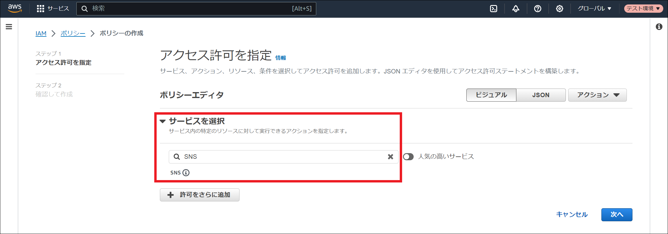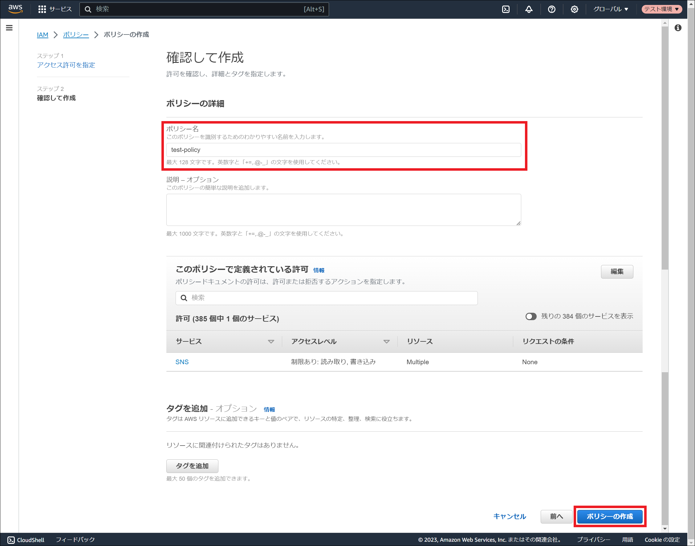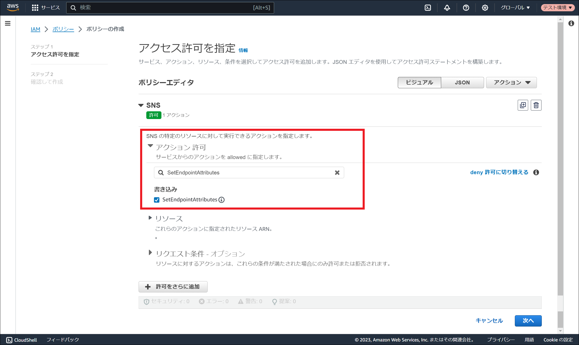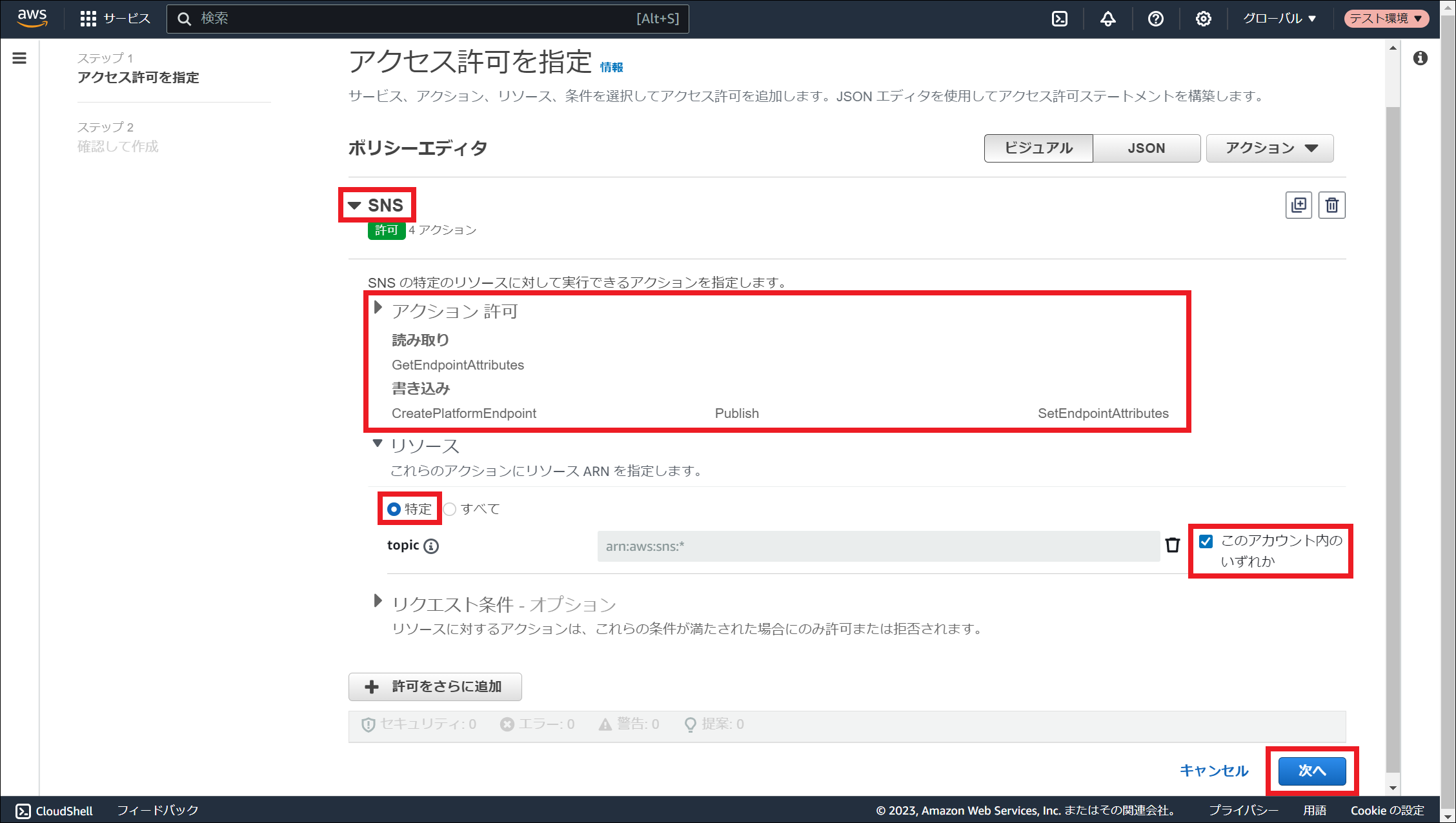 AWS Identity and Access Management (IAM) にサインインしてください。 「ポリシー」を選択し、「ポリシーを作成」を押下してください。 「サービスを選択」にて「SNS」を検索し、選択してください。 サービスを選択すると表示される「アクション許可」にて以下4つのアクションをそれぞれ検索し、チェックを入れてください。 選択したサービス、および、アクションが表示されていることを確認してください。その後、「リソース」にて「特定」を選択し、「このアカウント内のいずれか」にチェックを入れ、「次へ」を押下してください。 「ポリシー名」に任意のポリシー名を入力し、「ポリシーの作成」を押下してください。 ポリシーが作成されました。作成されたポリシー名は アクセスキーとシークレットキーの作成 や ロールの作成 に使用しますので、控えておいてください。