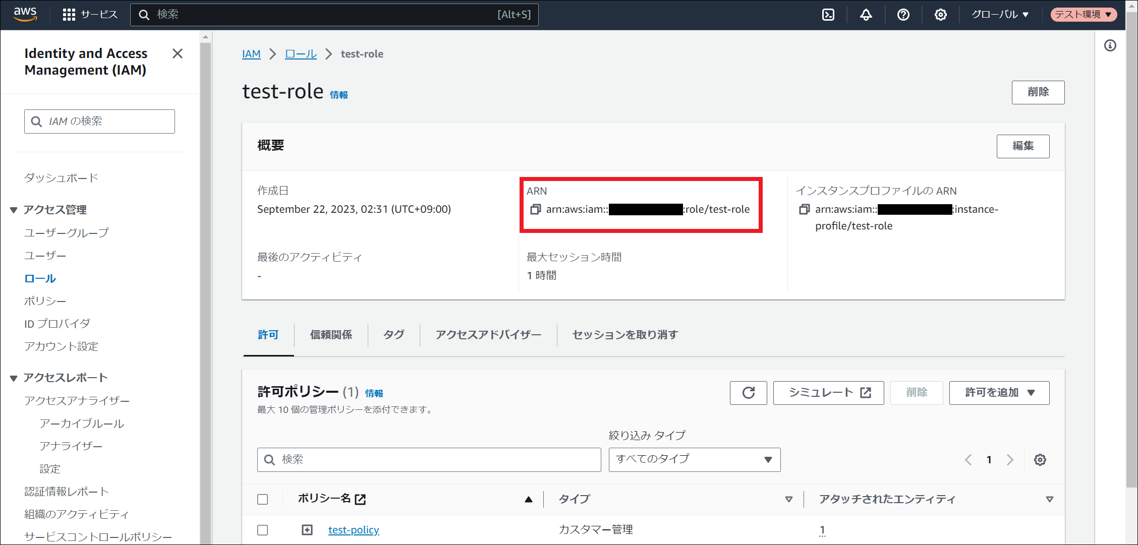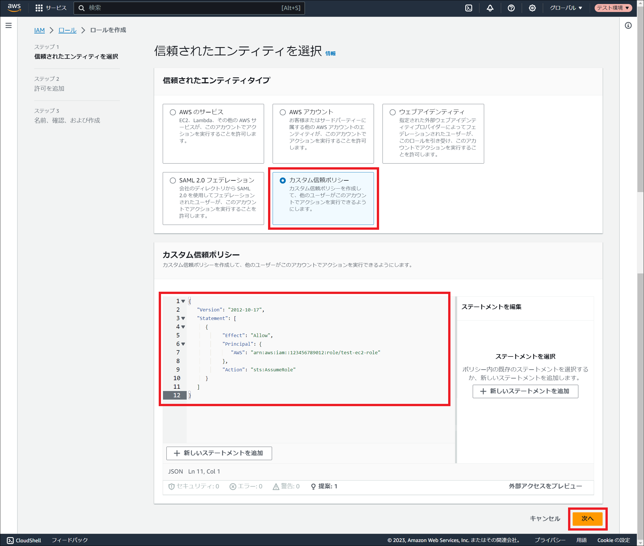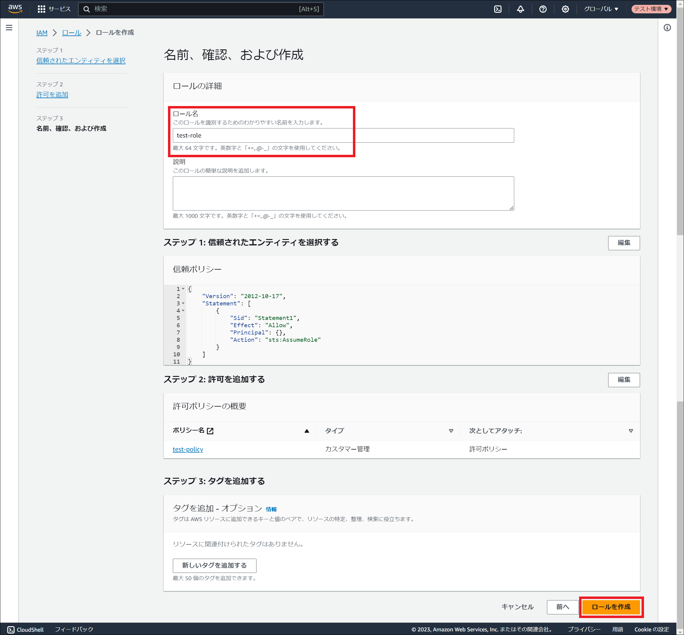 AWS Identity and Access Management (IAM) にサインインしてください。 「ロール」を選択し、「ロールを作成」を押下してください。 「信頼されたエンティティタイプ」にて「カスタム信頼ポリシー」を選択し、「カスタム信頼ポリシー」に以下を入力してください。${AWSアカウントID} と ${EC2インスタンスにアタッチされたロール名} の箇所は、お客様の環境に合わせて変更してください。その後、「次へ」を押下してください。{ "Version": "2012-10-17", "Statement": [ { "Effect": "Allow", "Principal": { "AWS": "arn:aws:iam::${AWSアカウントID}:role/${EC2インスタンスにアタッチされたロール名}" }, "Action": "sts:AssumeRole" } ] } 「許可ポリシー」にて、 ポリシーの作成 で作成したポリシー名にチェックを入れ、「次へ」を押下してください。 「ロール名」に任意のロール名を入力し、「ロールを作成」を押下してください。 ロールが作成されました。作成されたロールのARNは設定ファイルの編集に使用しますので、控えておいてください。