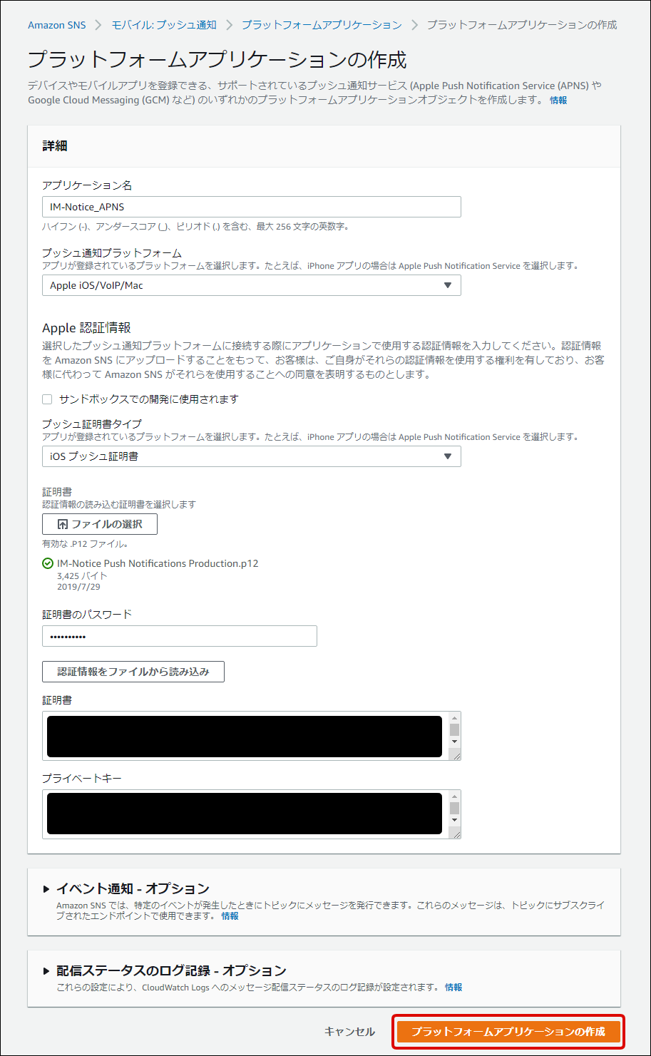 Amazon SNS にサインインしてください。 リージョンを選択してください。 サービスを選択してください。 「Mobile」-「プッシュ通知」から「プラットフォームアプリケーションの作成」をクリックしてください。 フォームに以下の内容を入力し、「プラットフォームアプリケーションの作成」をクリックしてください。