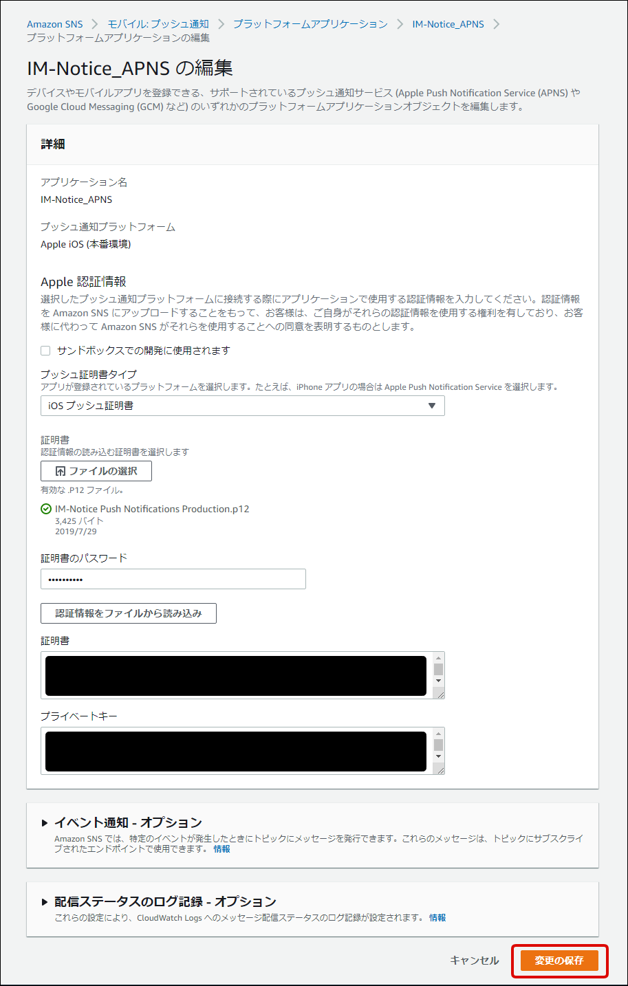 Amazon SNSにサインインしてください。 リージョンを選択してください。 サービスを選択してください。 「Mobile」ー「プッシュ通知」からアプリケーションを選択し、「編集」をクリックします。 フォームに以下の内容を入力し、「変更の保存」をクリックしてください。
