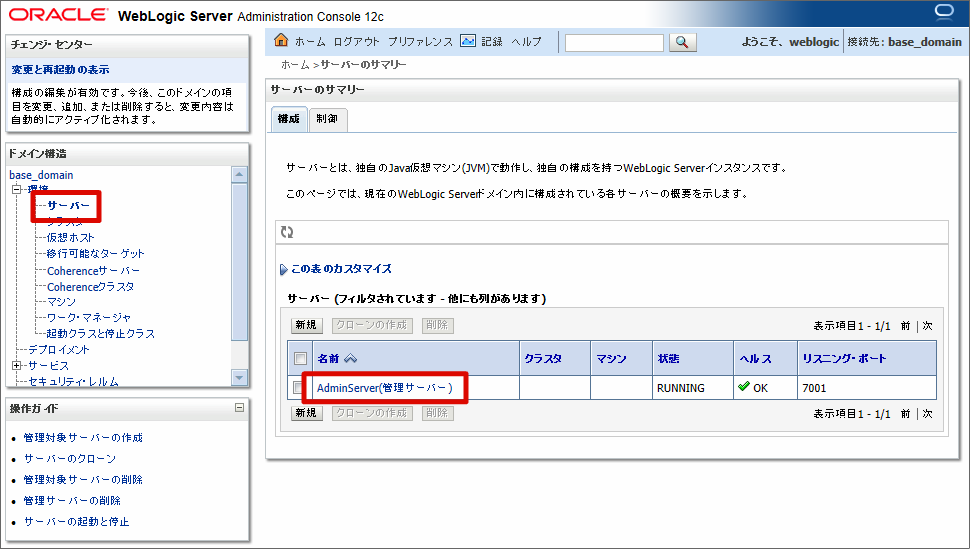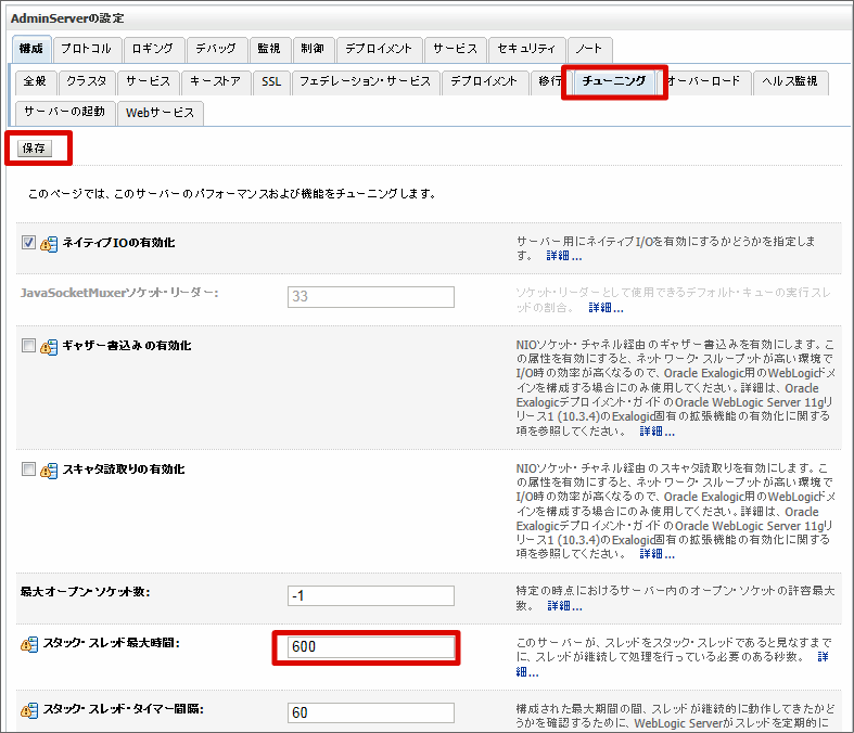 データベースの性能等により、テナント環境セットアップに時間がかかりスレッドをスタック状態とみなされセットアップが失敗する場合があります。 下記の手順で設定を変更してください。 左メニューの [環境]-[サーバ] を選択します。 右画面の使用するサーバを選択します。 [チューニング] タブを選択し、[スタック・スレッド最大時間] にデフォルト値より長い時間を入力します。 入力後、[保存]ボタンをクリックします。 Oracle WebLogic Server 12c R2(12.2.1) を再起動します。