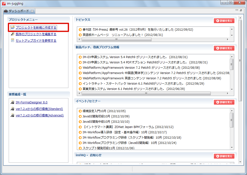 IM-Juggling はモジュールの管理、WARファイルを出力できる環境構築ツールです。このツールを使用し、新しい機能の導入や不具合修正の適用をします。