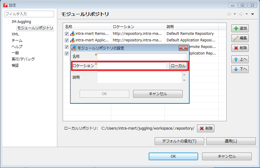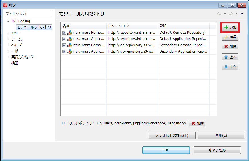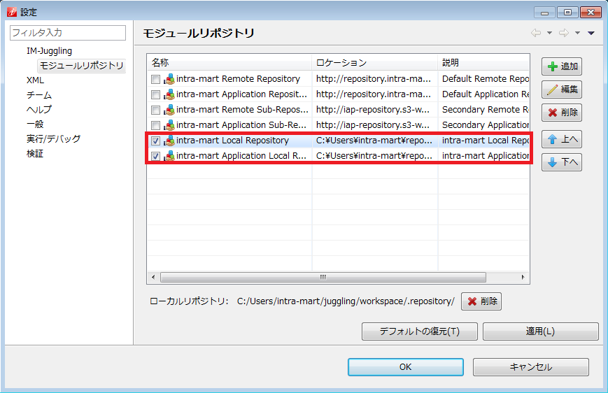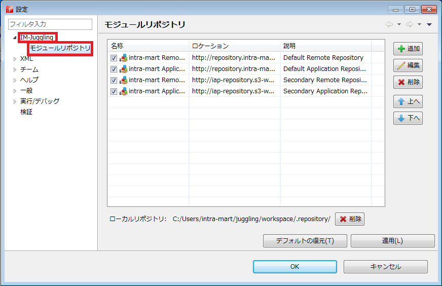 プロダクトファイルダウンロード より intra-mart Accel Platform のライセンスキーを入力してダウンロードリポジトリデータをコピーし、 IM-Juggling のモジュールリポジトリとして設定することで、インターネットに接続できない環境でも IM-Juggling を利用できます。以下の方法で、「platform」「products」のそれぞれのリポジトリデータをモジュールリポジトリとして設定してください。