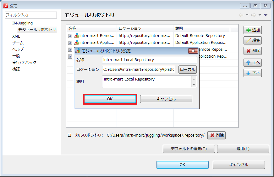 追加したモジュールリポジトリにチェックがついていることを確認し、「OK」をクリックします。