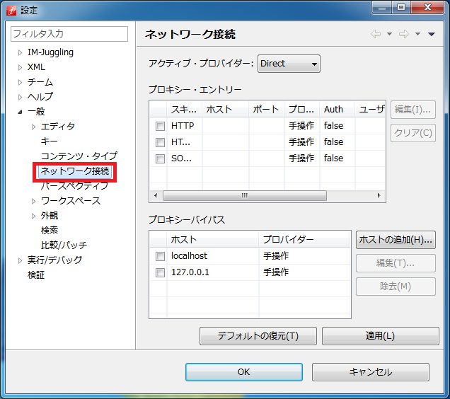 アクティブ・プロバイダとして「ネイティブ」を選択した場合、Internet Explorer のプロキシサーバの設定情報を引き継ぎます。(Internet Explorerで「Alt」キーを押してメニューを表示し、「ツール」→「インターネットオプション」→「接続」タブ→「LANの設定」で表示されるプロキシサーバの設定です)