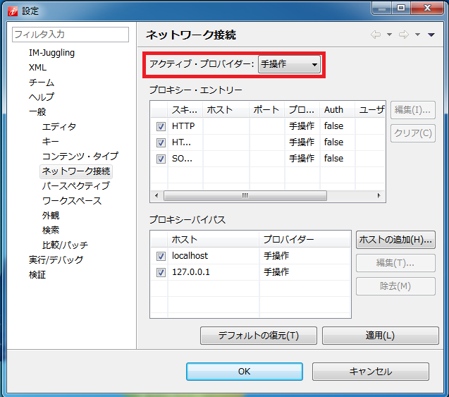 アクティブ・プロバイダに「手操作(マニュアル)」を選択します。