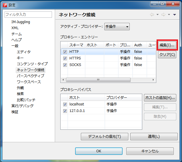 プロキシー・エントリーの「HTTP」の「編集」をクリックします。