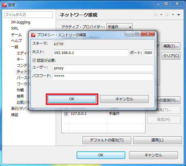 プロキシー・エントリーの編集」画面で「ホスト」、「ポート」、「認証情報」を設定して「OK」をクリックします。