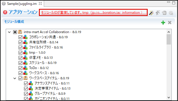 以下のようなエラーメッセージが表示されます。モジュールID が重複しているモジュールを削除してください。なお、削除実施後は<juggling.im>ファイルを開きなおしてください。コラム