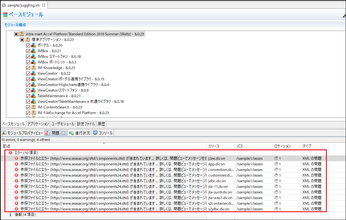 参照ファイルにエラー (http://www.seasar.org/dtd/components24.dtd) が含まれています 。 詳しくは、問題ビューでメッセージを右クリックし、「詳細表示...」を選択してください上記のエラーは war ファイルの作成、intra-mart Accel Platform の動作に影響はありません。このエラーを解消する場合は、出力された dicon ファイルの DTD の参照先を http から https に変更してください。2019 Winter(Xanadu) 以降の Juggling では、デフォルトで出力する dicon ファイルの DTD の参照先が https のため、Juggling プロジェクトを新規作成する場合はエラーは出力されません。注意