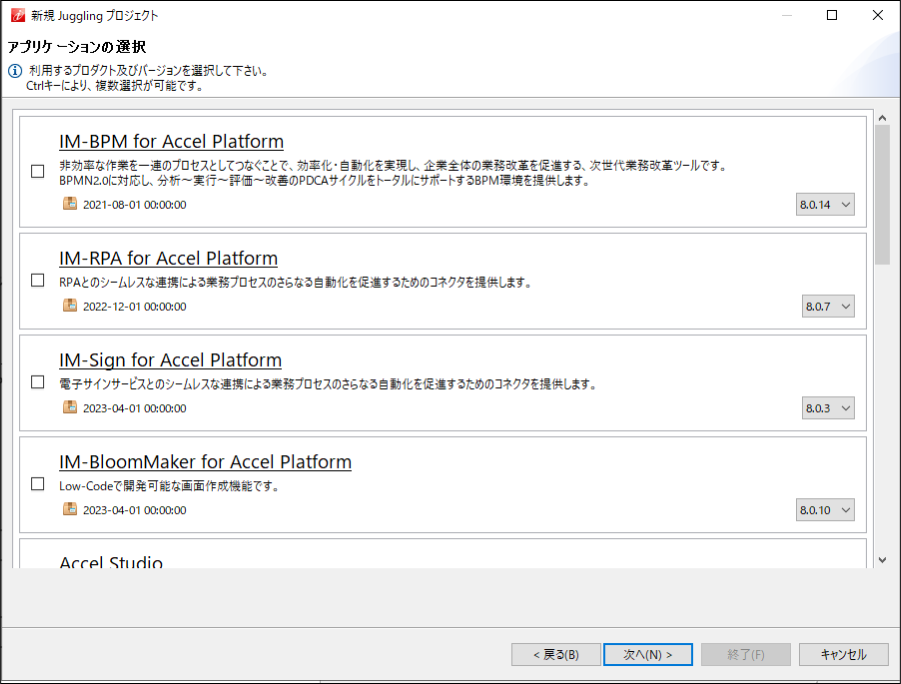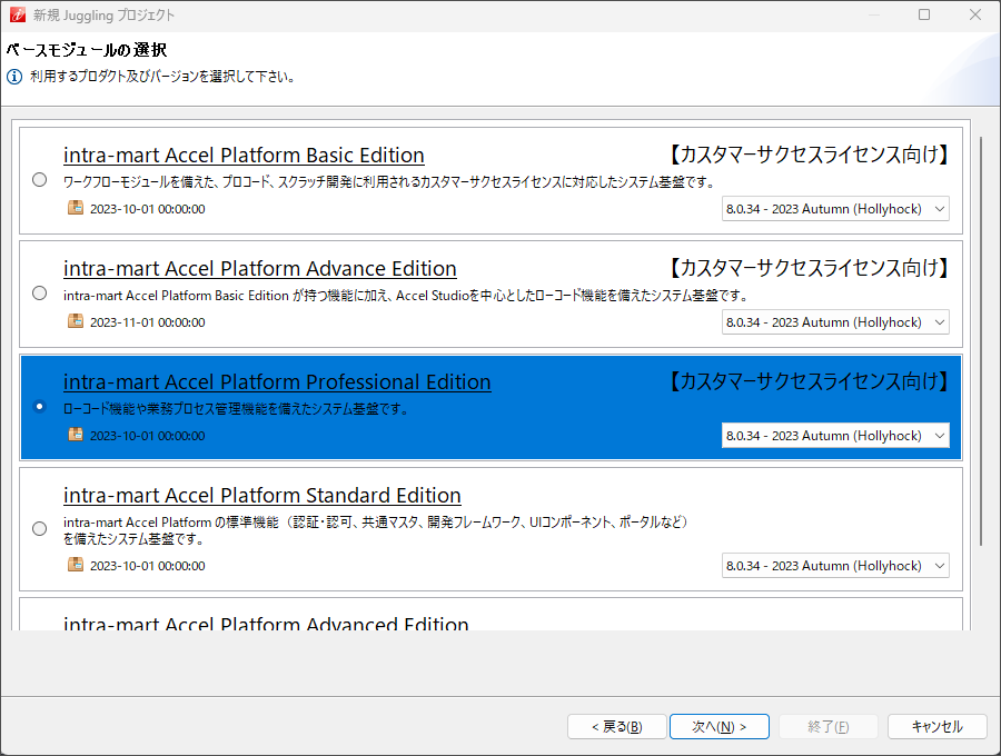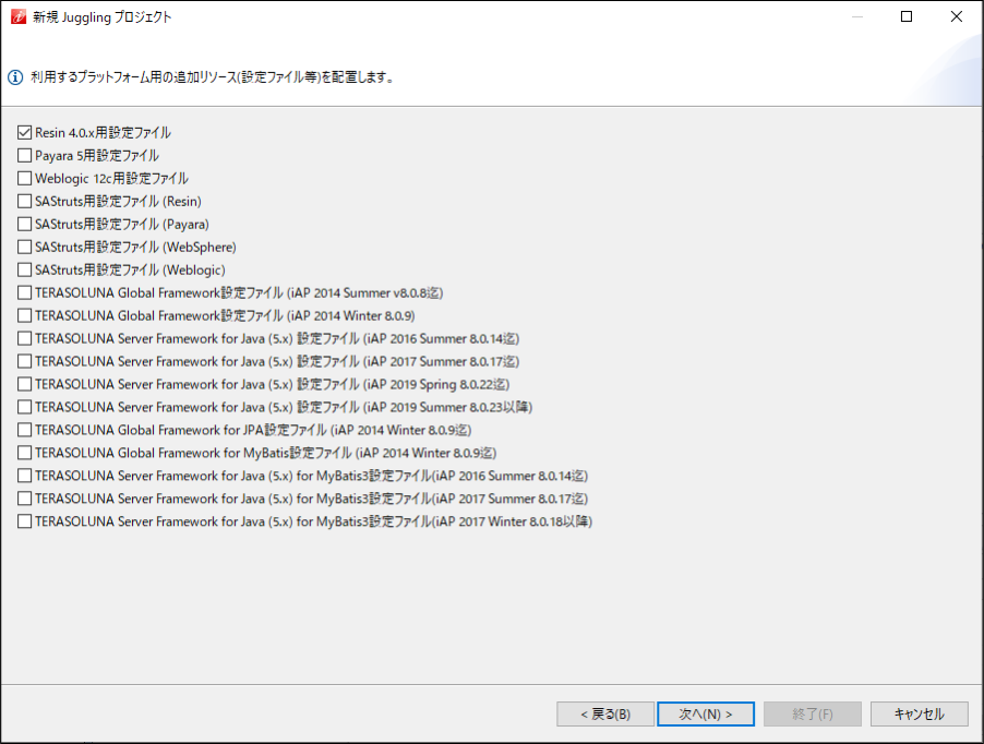 カスタマーサクセスライセンス向けのベーシックとプロフェッショナルは、intra-mart Accel Platform 2023 Spring(Gerbera) 以降より、ご利用いただけます。カスタマーサクセスライセンス向けのアドバンスは、intra-mart Accel Platform 2023 Autumn(Hollyhock) 以降より、ご利用いただけます。ASEAN地域向けのプロコードとローコードは、intra-mart Accel Platform 2024 Spring(Iris) 以降より、ご利用いただけます。 利用するアプリケーションを選択します。選択後、「次へ(N)」をクリックします。 利用するプラットフォーム用の追加リソース(設定ファイル等)を選択します。選択後、「次へ(N)」をクリックします。注意
