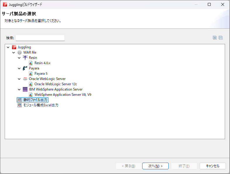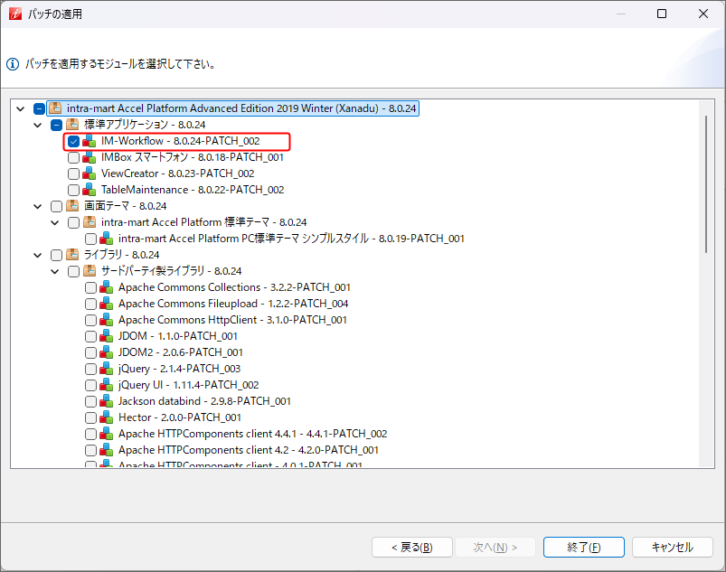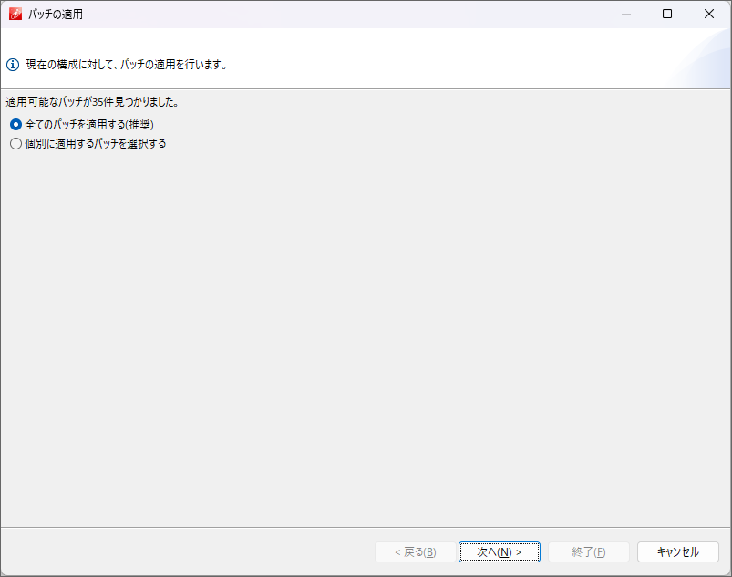 パッチ適用方法を選択します。「全てのパッチを適用する(推奨)」「個別に適用するパッチを選択する」のどちらかを選択してください。選択後、「次へ(N)」をクリックします。 前画面で「全てのパッチを適用する(推奨)」を選択していた場合、適用するパッチ内容が表示されます。適用するパッチ内容を確認し「終了(E)」をクリックします。 前画面で「個別に適用するパッチを選択する」を選択していた場合、パッチを適用するモジュールを選択します(チェックボックスにチェックをいれます)。選択後、「終了(E)」をクリックします。パッチ情報を取得し、既存プロジェクトのモジュール情報が変更されます。