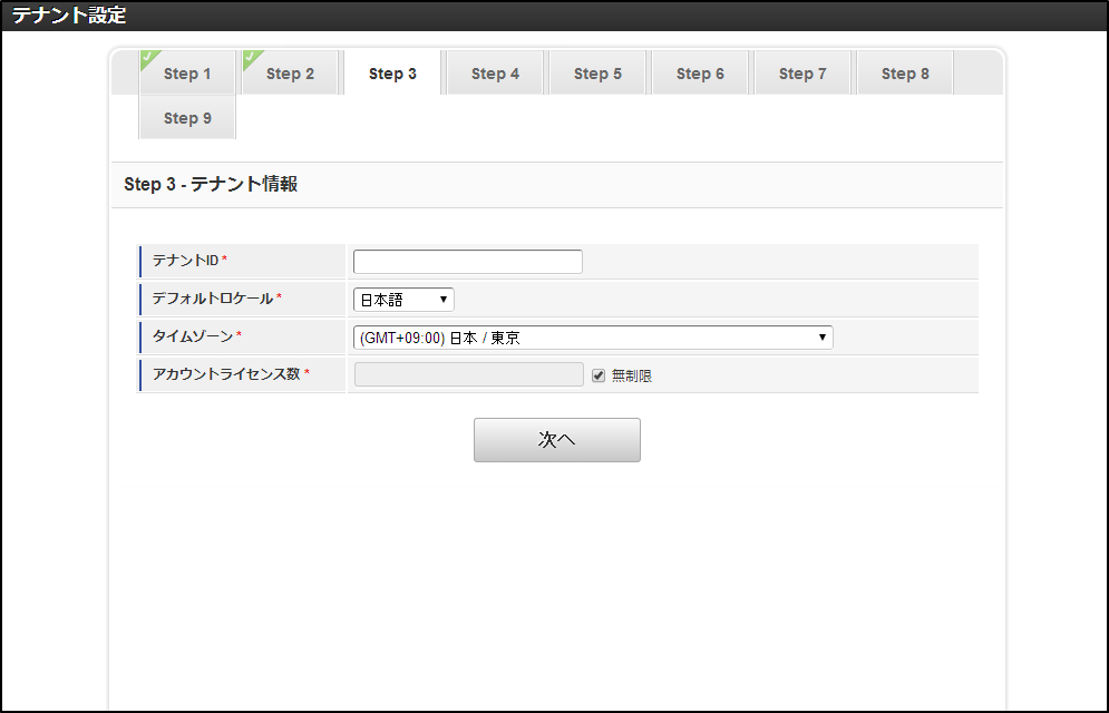 項目 必須/任意 説明 テナントID 必須 テナントのIDを入力します。「DataSourceマッピングの設定 」の <tenant-id> で設定した値を入力します。DataSourceマッピングの設定を行っていない場合は、「 default 」を入力します。デフォルトロケール 必須 テナントのデフォルトロケールを選択します。初期表示されているロケールは、アクセスしているブラウザのロケール設定です。このロケールは運用中に変更することは推奨していません。運用に応じたロケールを設定してください。タイムゾーン 必須 テナントのタイムゾーンを選択します。 アカウントライセンス数 必須 テナントのアカウントライセンス数を入力します。テナント管理者を登録するため「1」以上を入力してください。注意