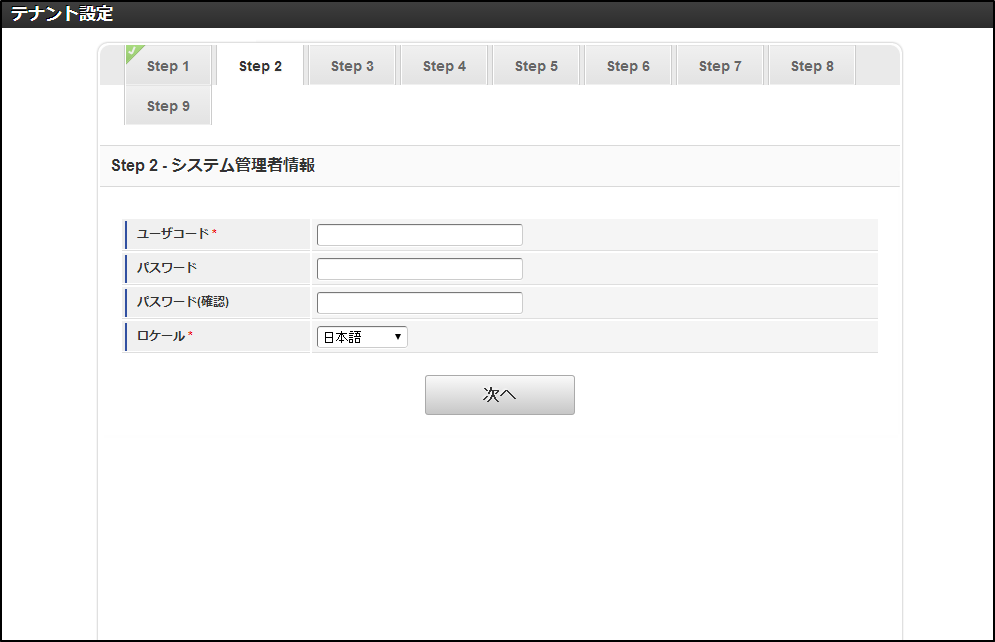 項目 必須/任意 説明 ユーザコード 必須 システム管理者のユーザコードを入力します。 (例:system) パスワード 任意 システム管理者のパスワードを入力します。 パスワード(確認) 任意 システム管理者のパスワードを入力します。 ロケール 必須 システム管理者のロケールを選択します。 初期表示されているロケールは、アクセスしているブラウザのロケール設定です。 コラム “任意”項目は、必要に応じて入力してください。必要がなければ入力の必要はありません。