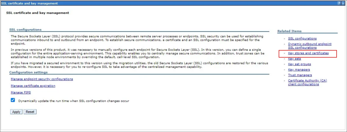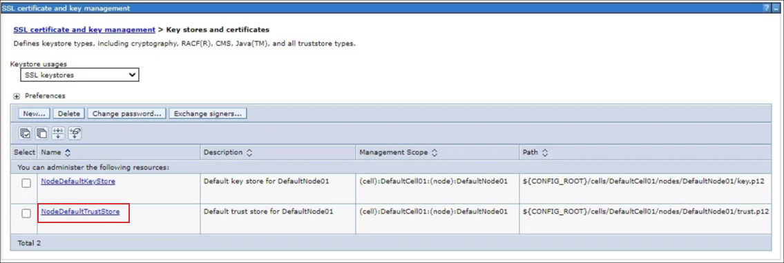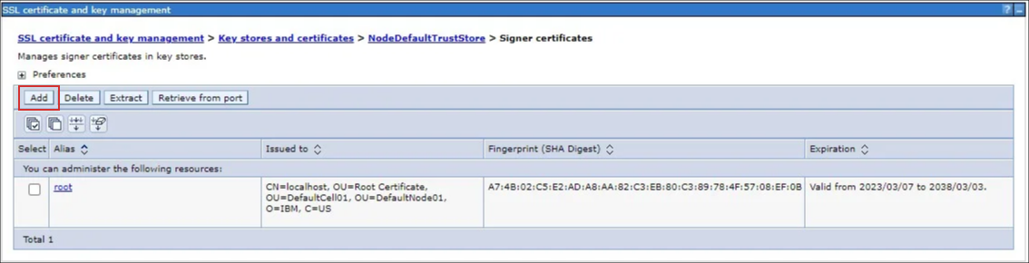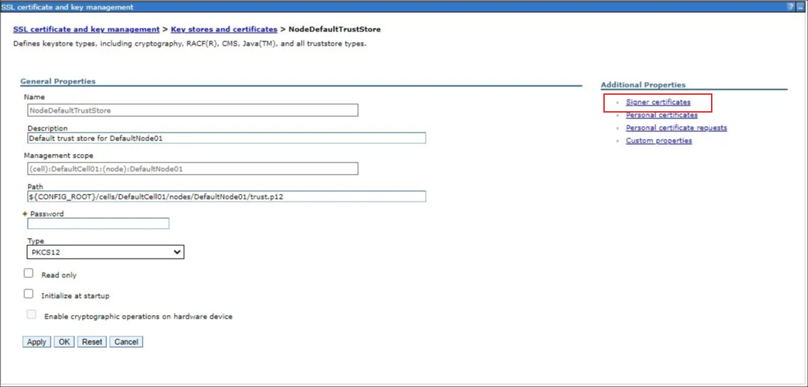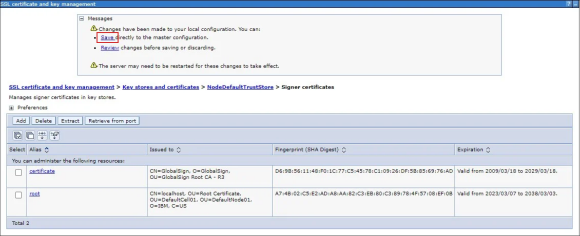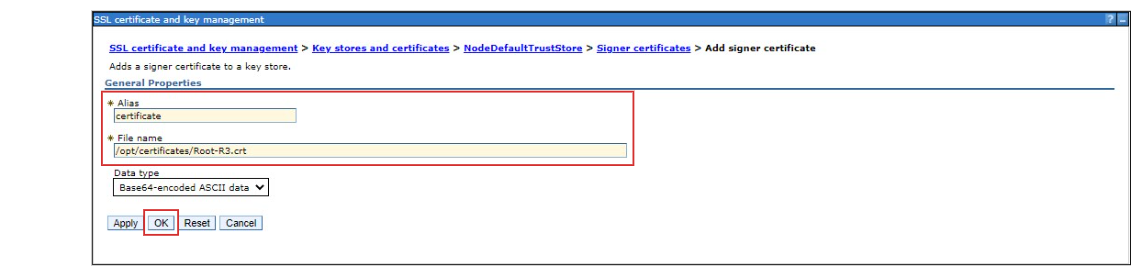 メニューから[Security]-[SSL certificate and key management] を選択します。 [Key stores and certificates] を選択します。 [NodeDefaultTrustStore] を選択します。 [Signer certificates] を選択します。 [Add] ボタンをクリックします。 [Alias] に任意の名前、[File name] に配置したルート証明書のパスを入力して、[OK] ボタンをクリックします。 [save] をクリックします。取得したもう一つの証明書についても同様の手順でルート証明書を設定し、設定手順は終了です。