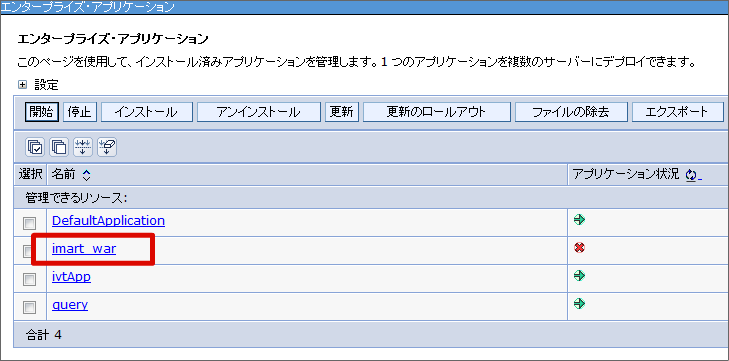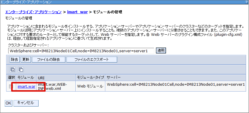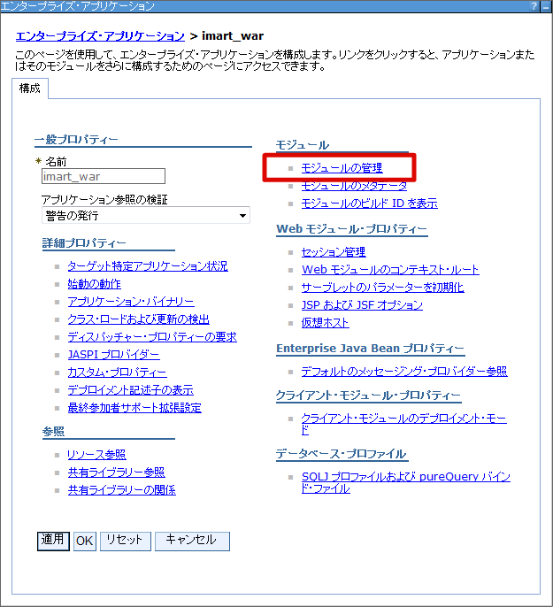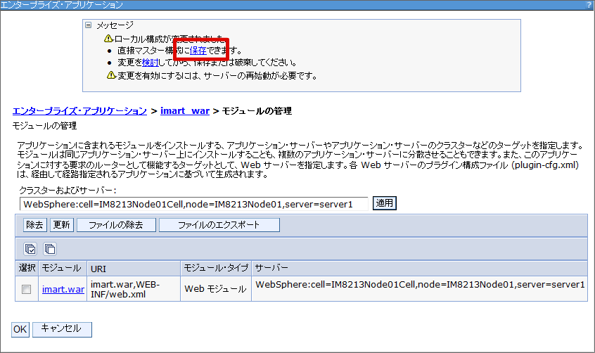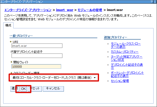 クラスローダーの設定を行います。 メニューから[アプリケーション]-[アプリケーション・タイプ]-[WebSphere エンタープライズ・アプリケーション] を選択します。 [imart_war] リンクをクリックします。 [モジュールの管理] リンクをクリックします。 [imart.war] リンクをクリックします。 クラスローダーの順序を「最初にローカル・クラスローダーをロードしたクラス(親は最後)」に変更し[OK]をクリックします。 [保存]をクリックします。これで、クラスローダーの設定は終わりです。