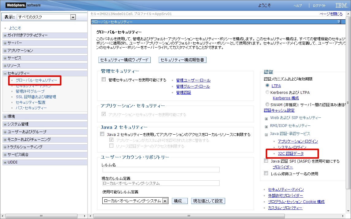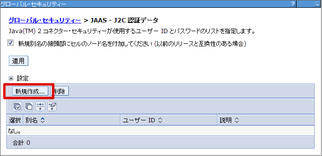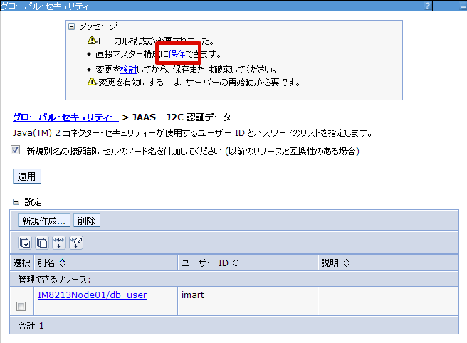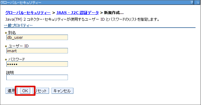 DBユーザ情報の設定を行います。 WebSphereの管理コンソールにログインし、[セキュリティー]-[グローバル・セキュリティー]の[認証]-[Java 認証・承認サービス]-[J2C 認証データ] を選択します。 [新規作成] ボタンをクリックします。 別名(任意)、DBユーザID、パスワードを入力し、[OK] ボタンをクリックします。 こでは別名を 「db_user」 とします。 [保存]をクリックします。これで、DBユーザ情報の設定は終わりです。