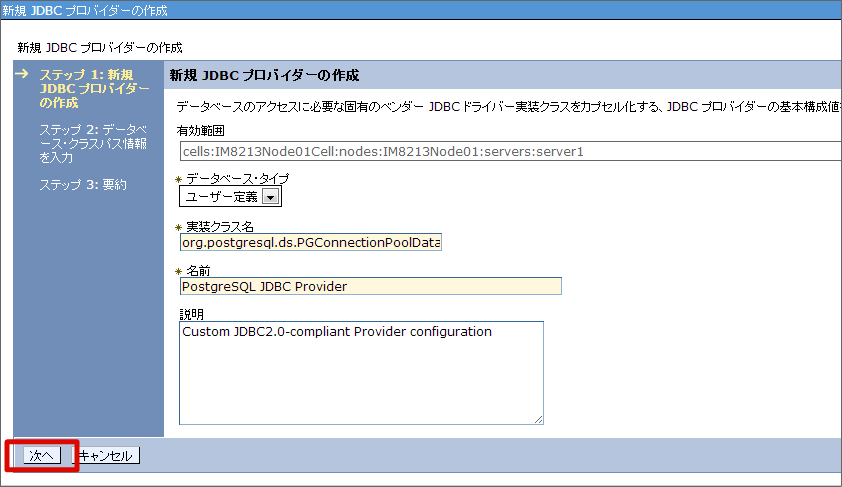 メニューから[リソース]-[JDBC]-[JDBC プロバイダー] を選択します。 「JDBC プロバイダー」画面で [新規作成] ボタンをクリックします。 [データベース・タイプ]、[プロバイダー・タイプ]、[実装タイプ]を設定し、[次へ]ボタンをクリックします。