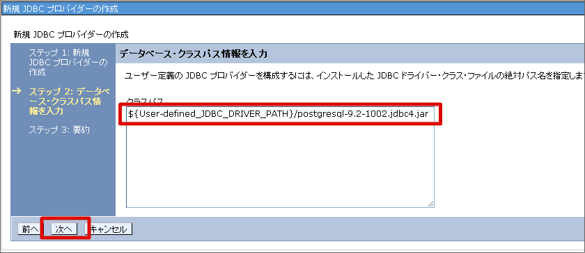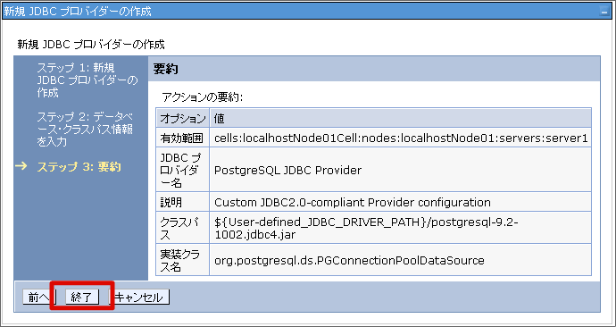 設定項目 値 データベース・タイプ ユーザ定義 プロバイダー・タイプ org.postgresql.ds.PGConnectionPoolDataSource JDBCドライバのディレクトリ・ロケーションを設定し、[次へ]ボタンをクリックします。JDBCドライバのファイル名が「 postgresql-9.2-1002.jdbc4.jar 」の場合は下記のように設定します。 設定内容を確認し、[終了]ボタンをクリックします。 [保存]をクリックします。これで、JDBCプロバイダーの設定は終わりです。