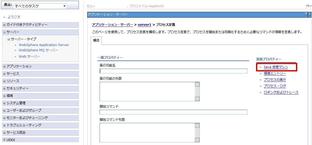 メニューから[サーバー]-[サーバー・タイプ]-[WebSphere Application Server] を選択します。 サーバーの名前を選択します。 [サーバー・インフラストラクチャー]-[Java およびプロセス管理]-[プロセス定義] を選択します。 [追加プロパティー]-[Java 仮想マシン] を選択します。 ヒープサイズを入力します。 汎用 JVM 引数を入力します。ここでは下記の引数を設定します。