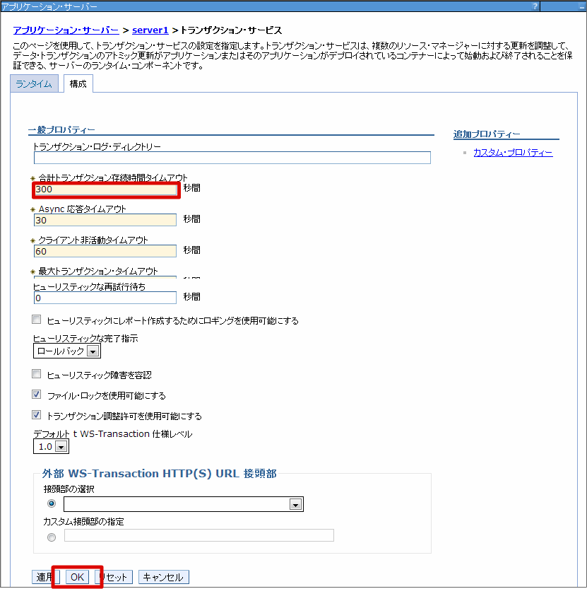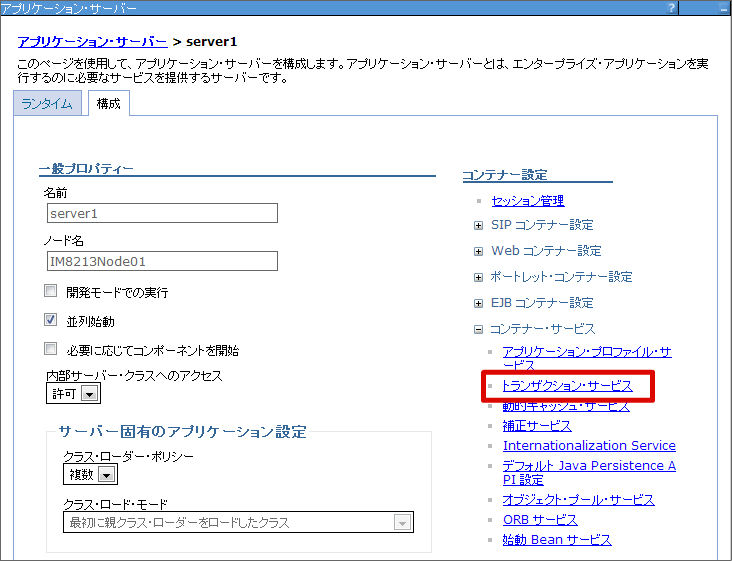 トランザクション・タイムアウトの設定を行います。 テナント環境構築時などの時間がかかるトランザクション処理のために、トランザクション・タイムアウトの時間を変更します。 メニューから[サーバー]-[サーバー・タイプ]-[WebSphere Application Server] を選択します。 サーバーの名前を選択します。 [コンテナー・サービス]-[トランザクション・サービス] を選択します。 [合計トランザクション存続時間タイムアウト] を変更し、[OK] ボタンをクリックします。 [保存]をクリックします。これで、トランザクション・タイムアウトの設定は終わりです。