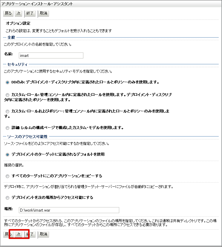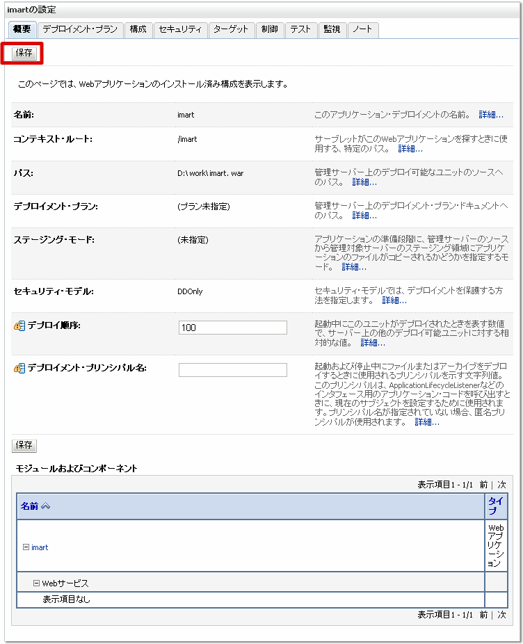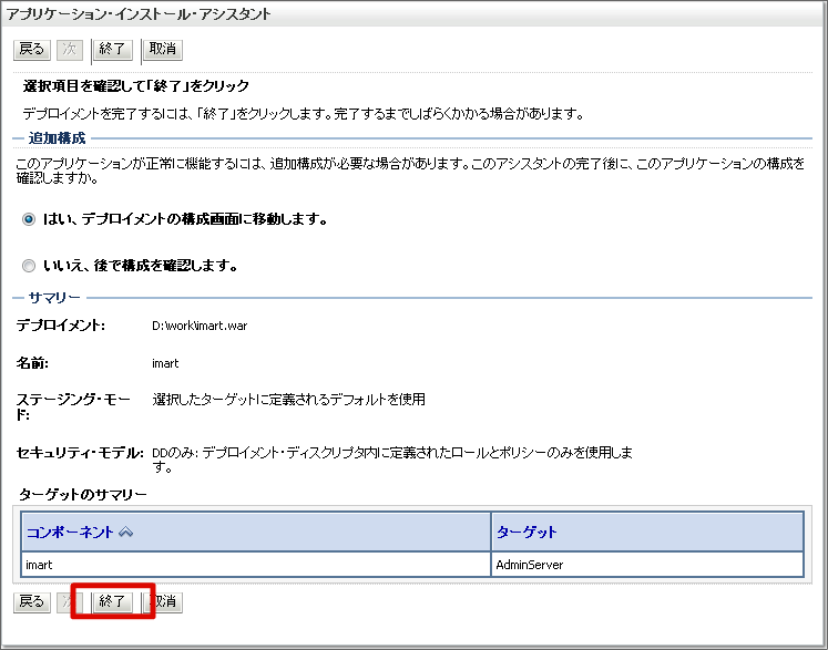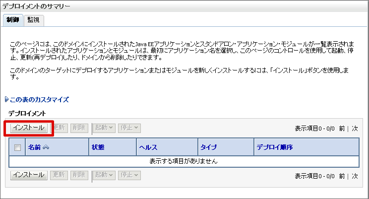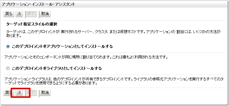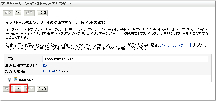 warファイルのデプロイを行います。 左メニューの [デプロイメント] を選択します。 [インストール]ボタンをクリックします。 [パス]にwarファイルのフルパスを入力し、[次]ボタンをクリックします。 [次]ボタンをクリックします。 [次]ボタンをクリックします。 [終了]ボタンをクリックします。 [保存]ボタンをクリックします。これで、warファイルのデプロイは終わりです。