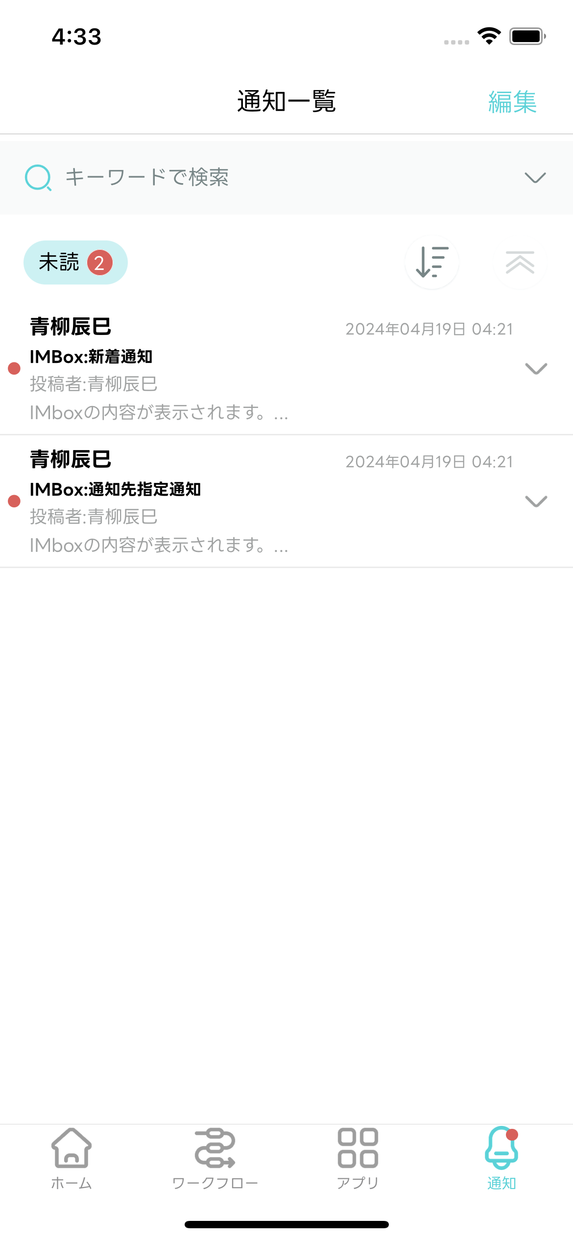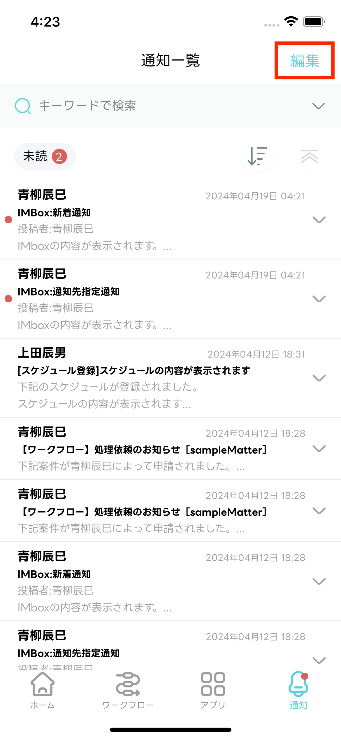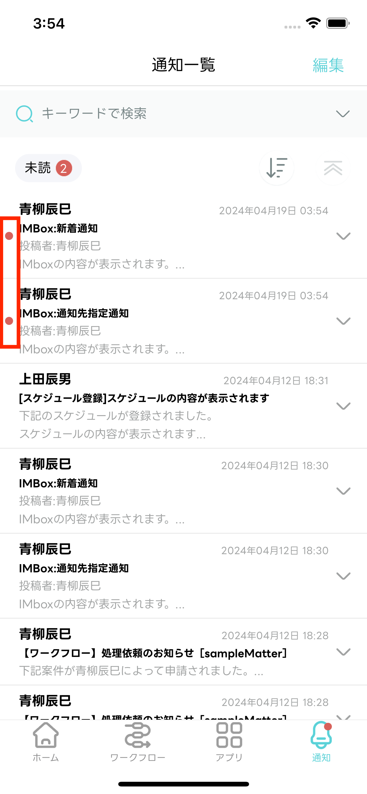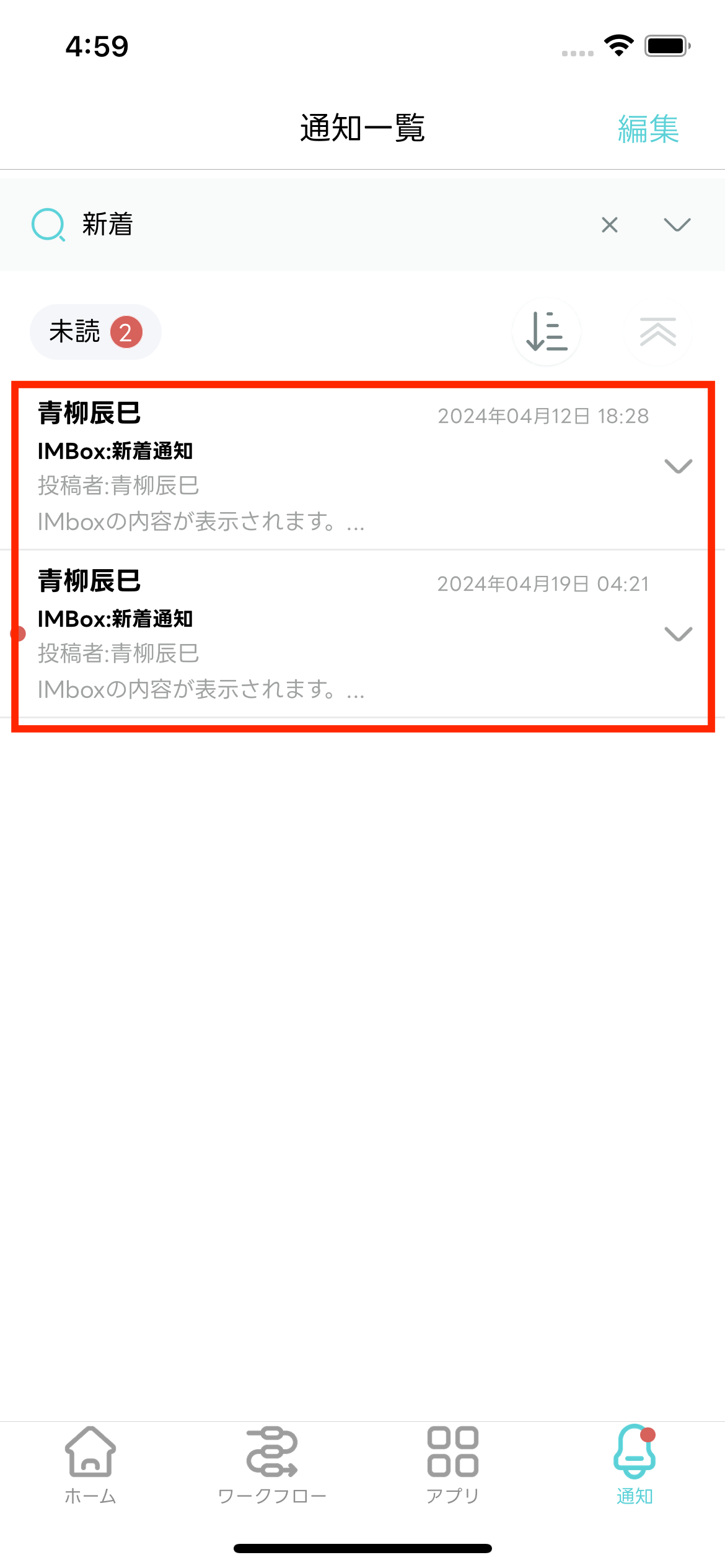 - 編集モードが終了し「通知一覧」画面に戻ります。選択した通知メッセージが既読化されます。