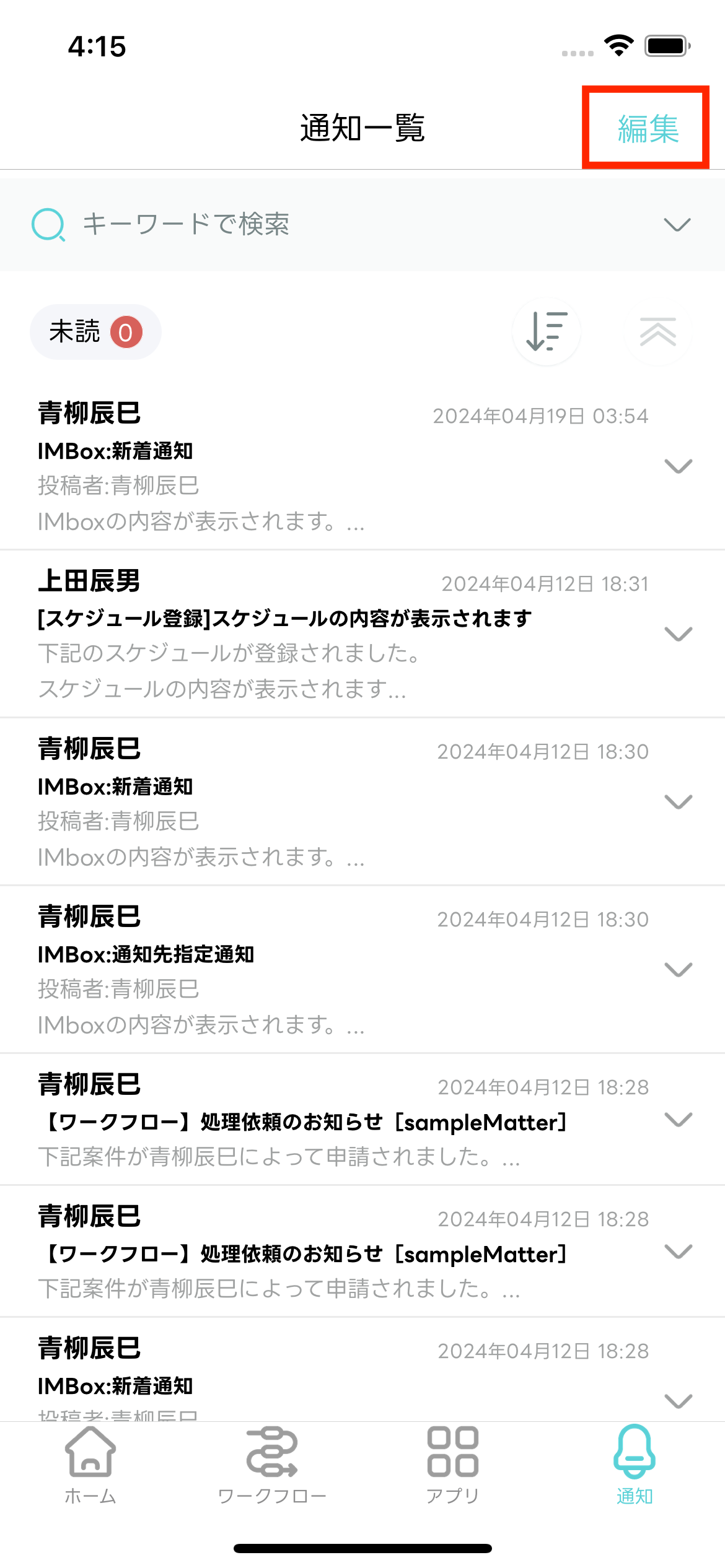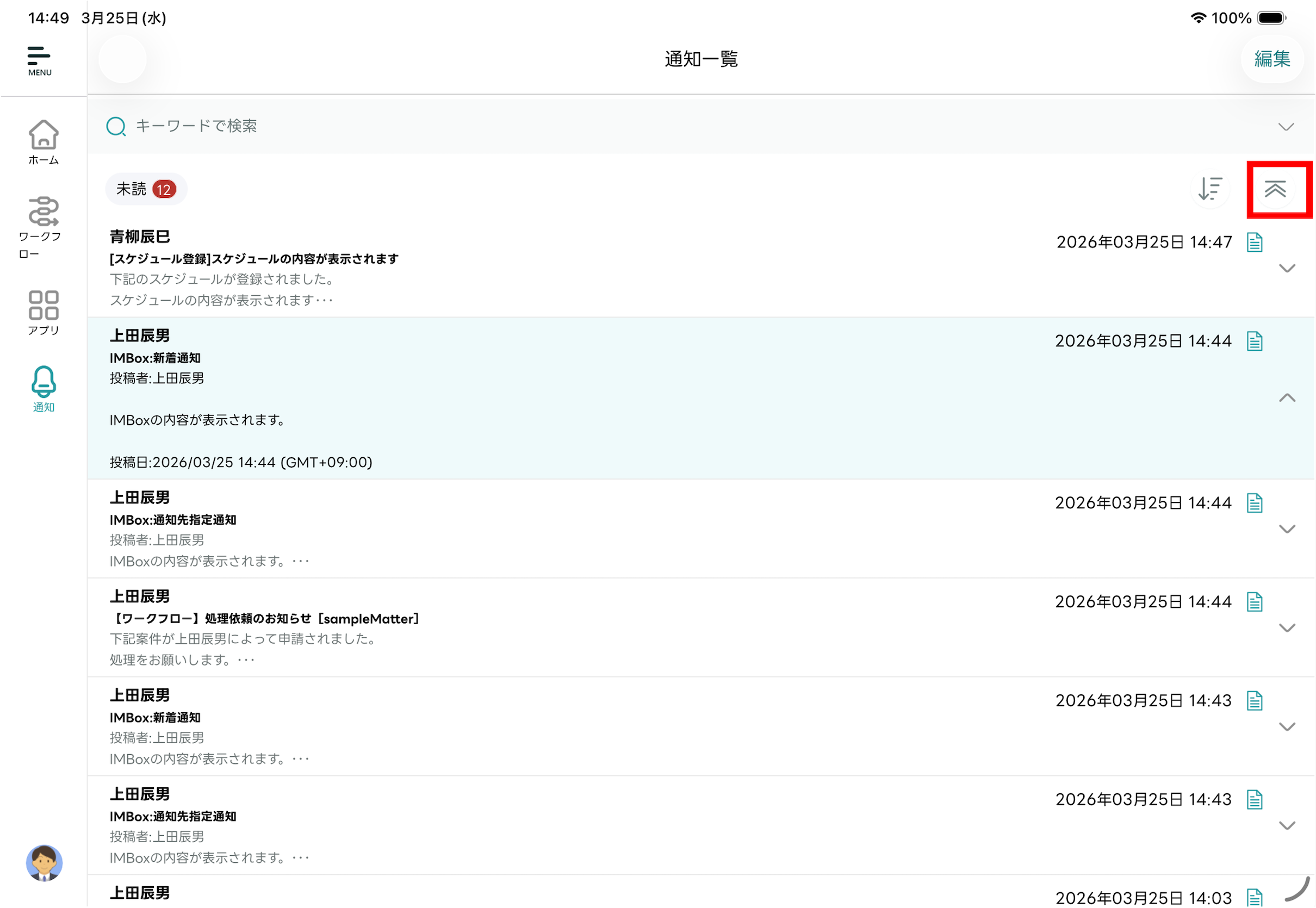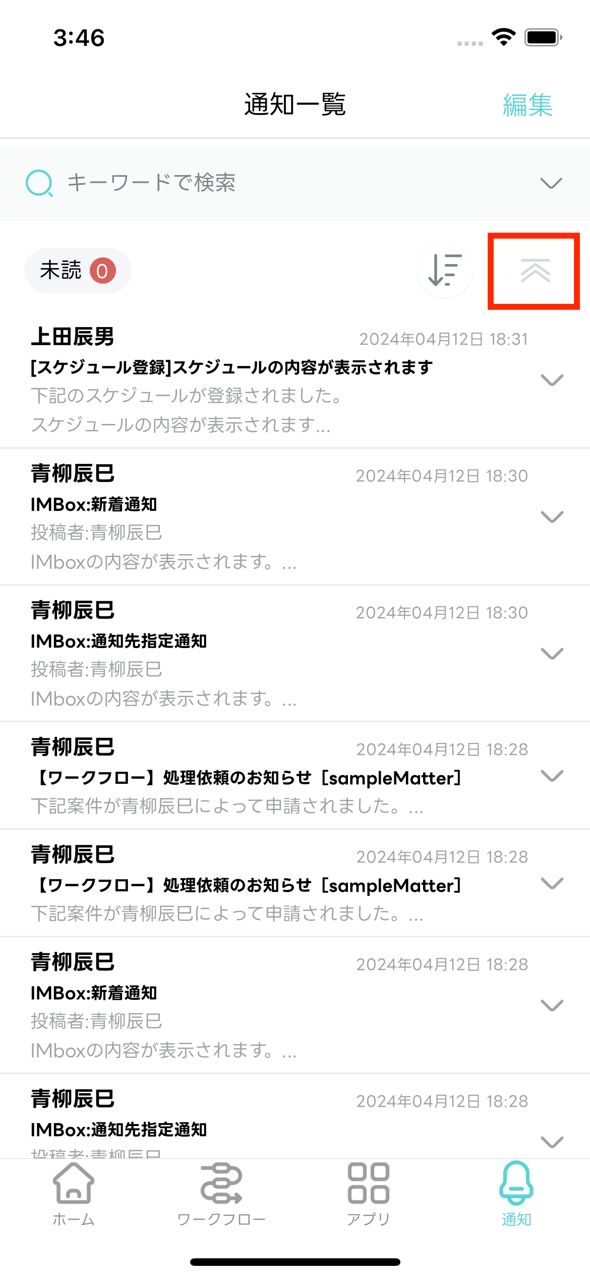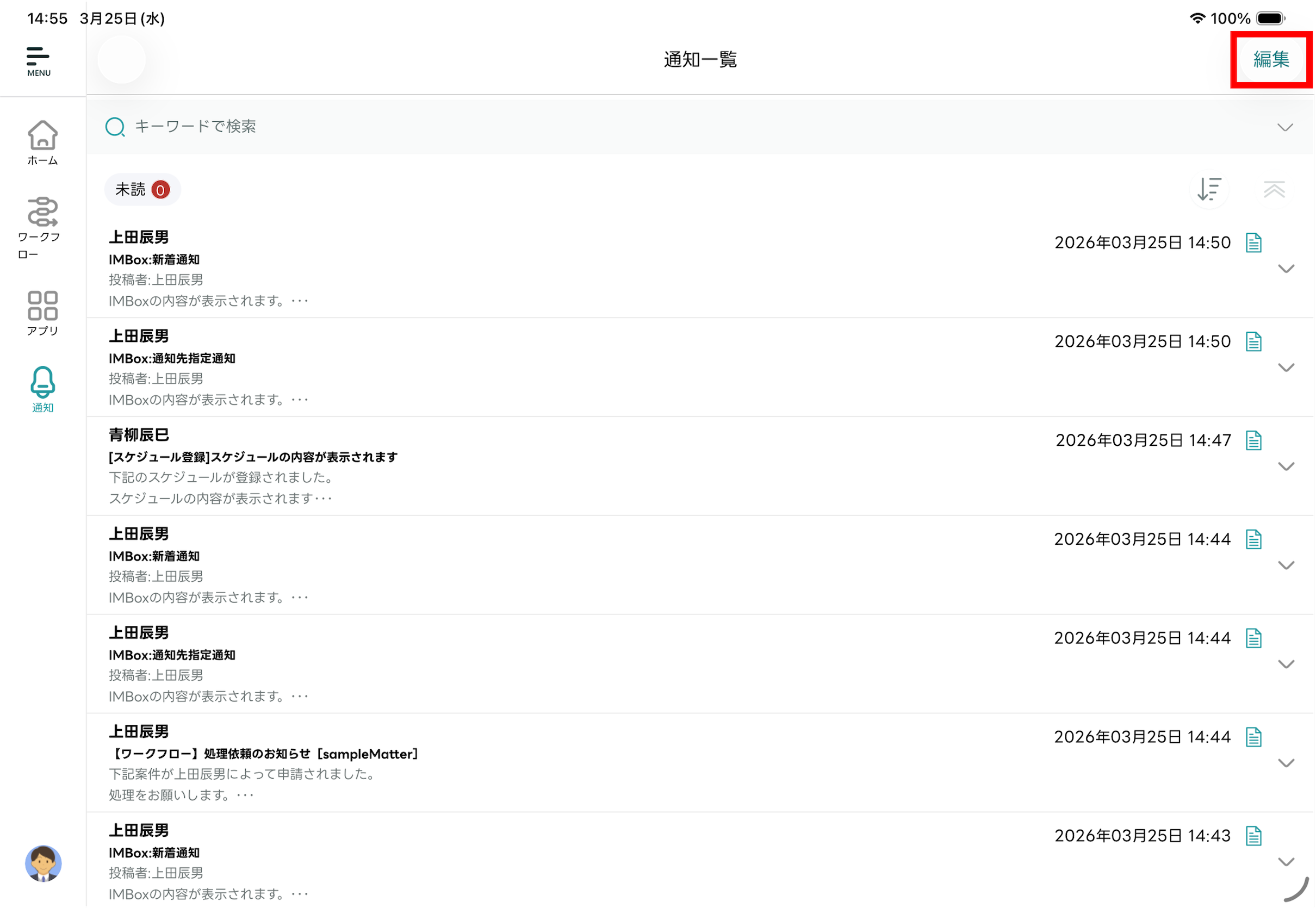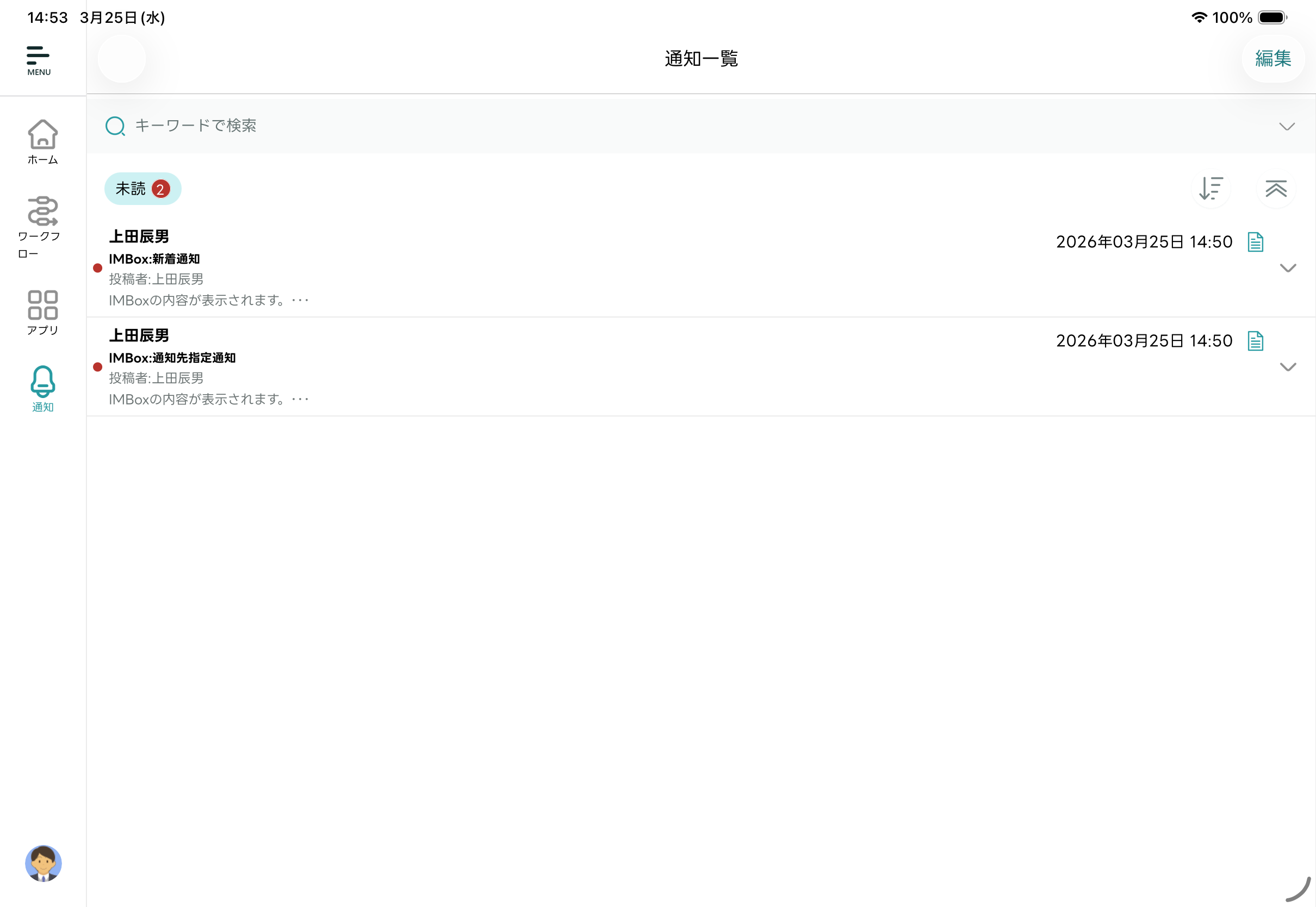 - 編集モードが終了し「通知一覧」画面に戻ります。選択した通知メッセージが既読化されます。