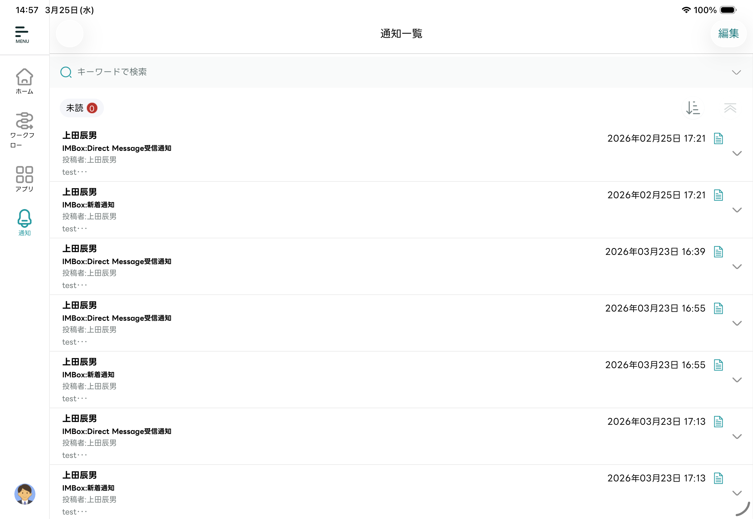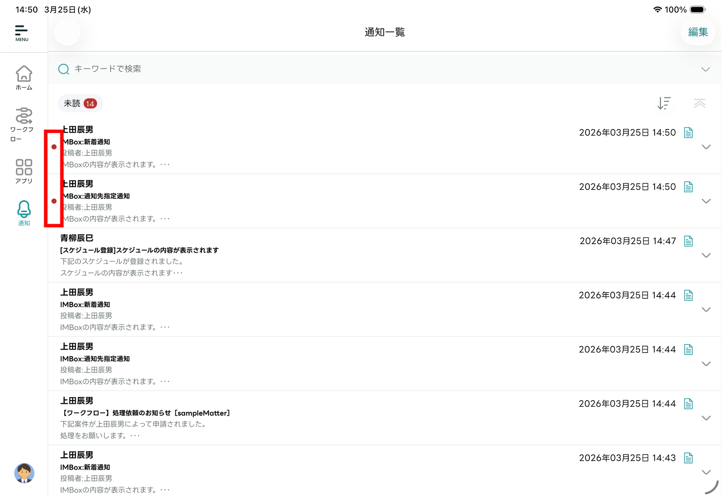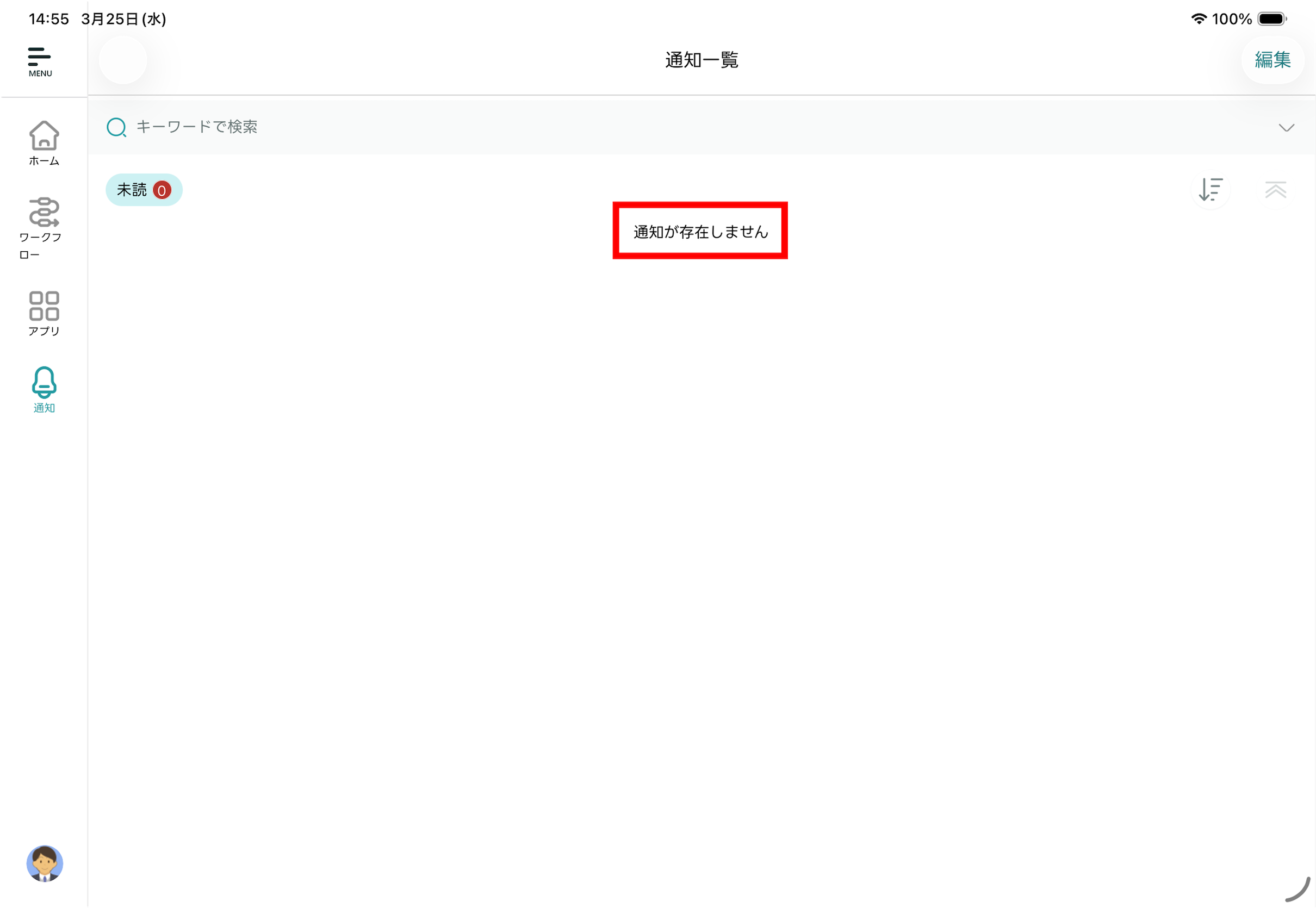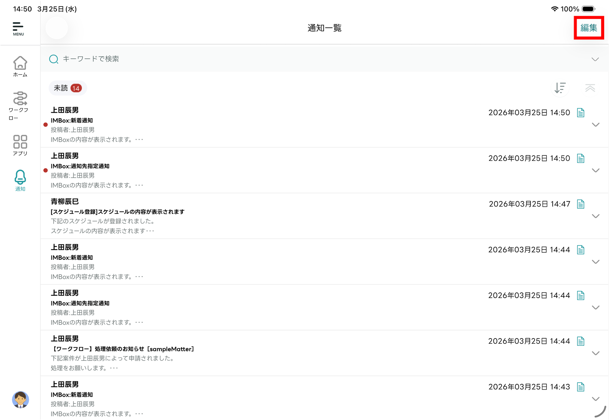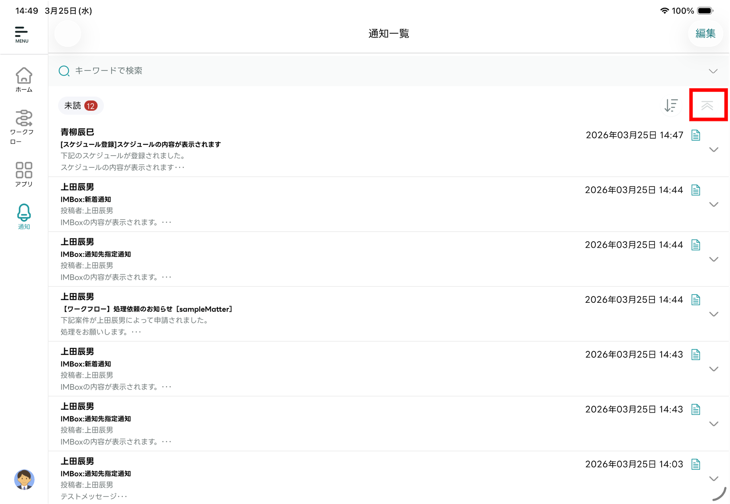 - 編集モードが終了し「通知一覧」画面に戻ります。選択した通知メッセージが既読化されます。