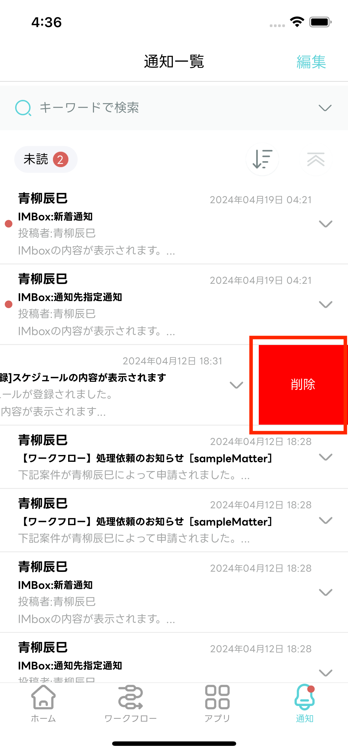 - 編集モードが終了し「通知一覧」画面に戻ります。選択した通知メッセージが削除されます。