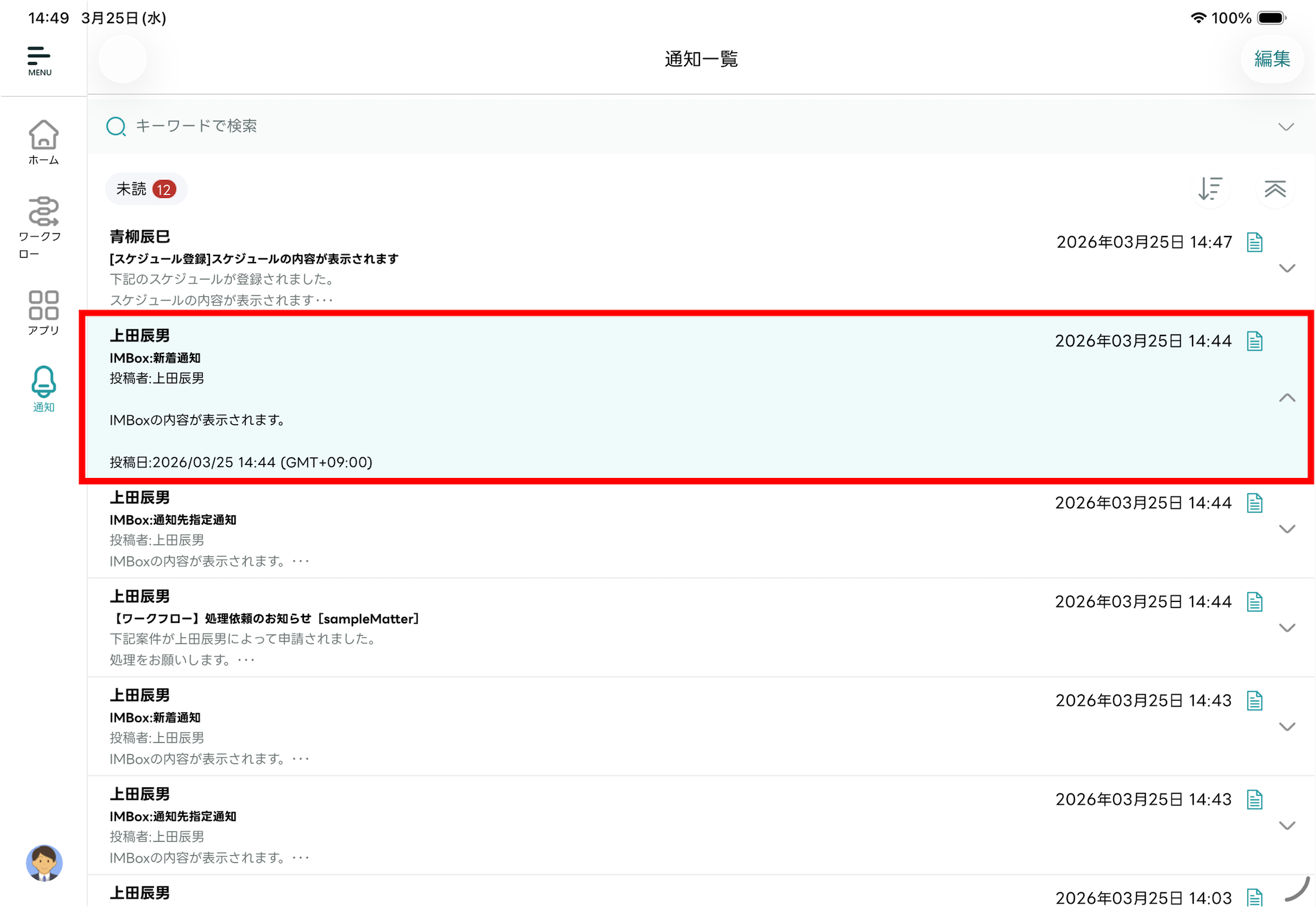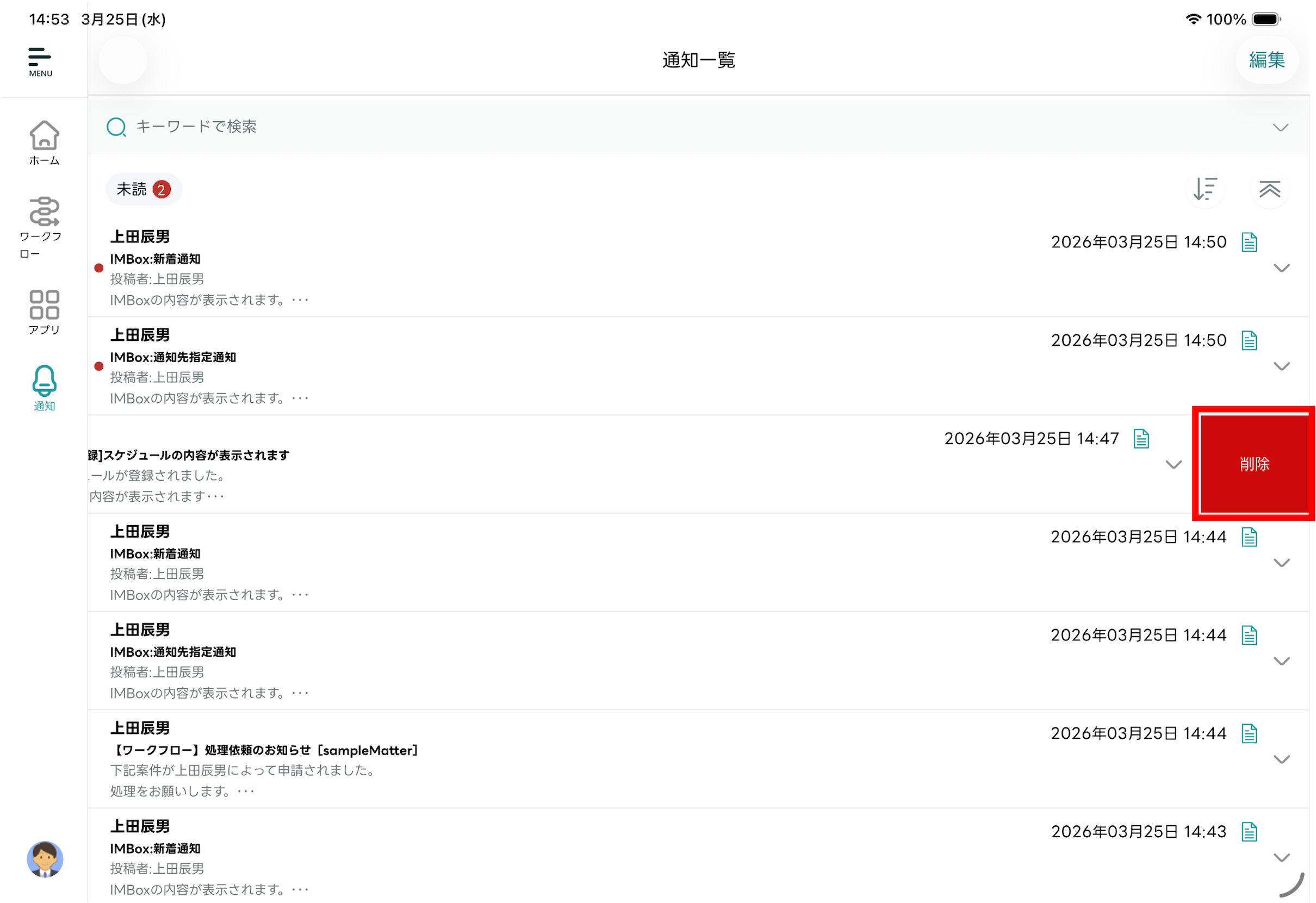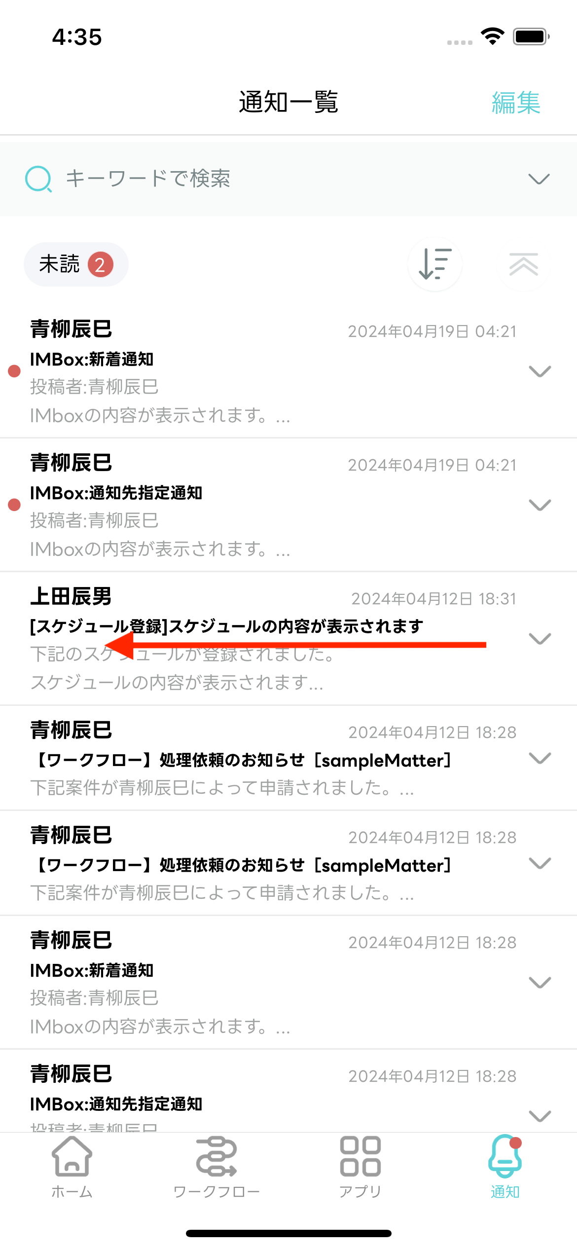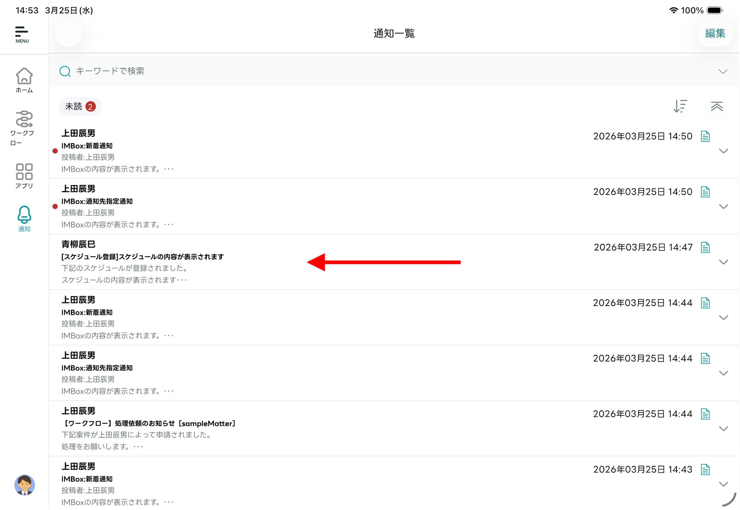 - 受信した通知を一覧で確認できます。