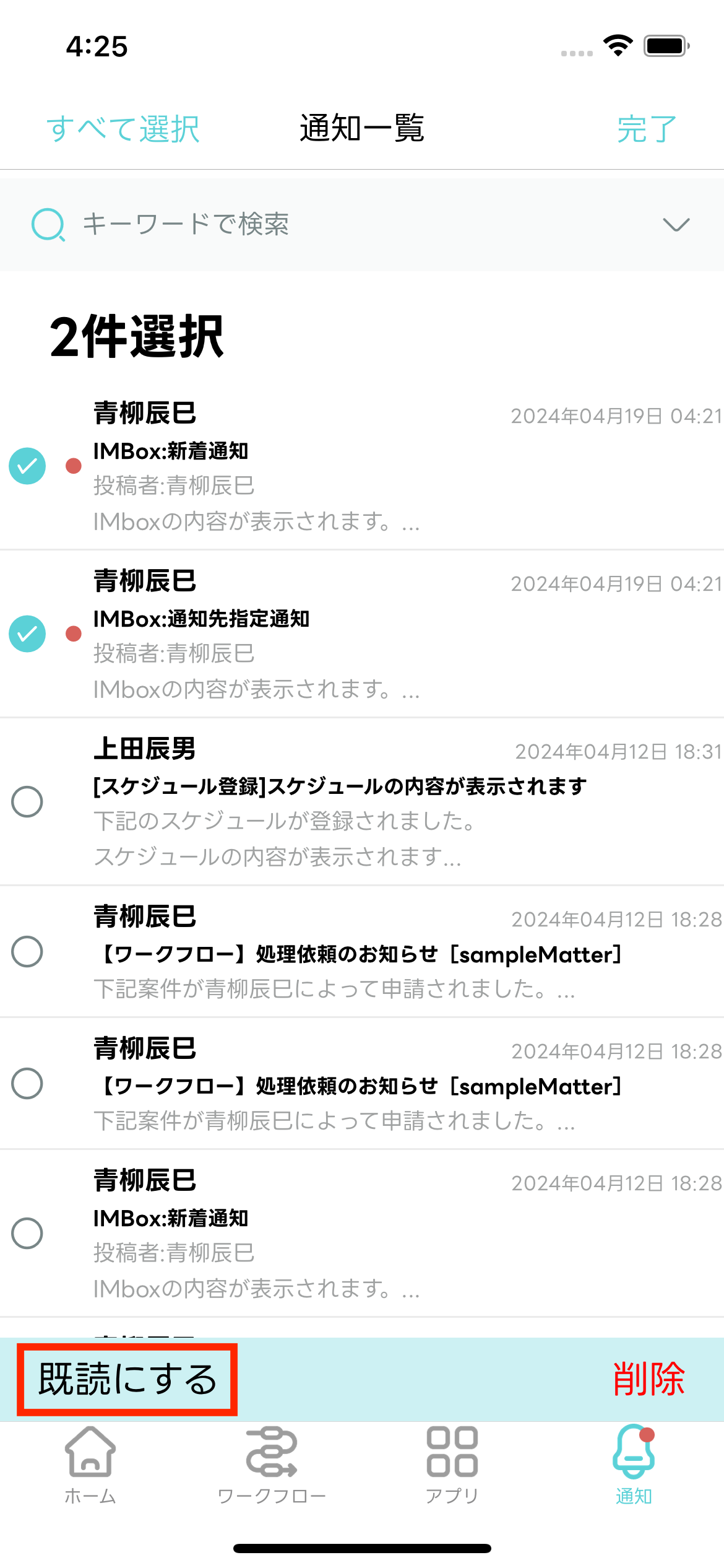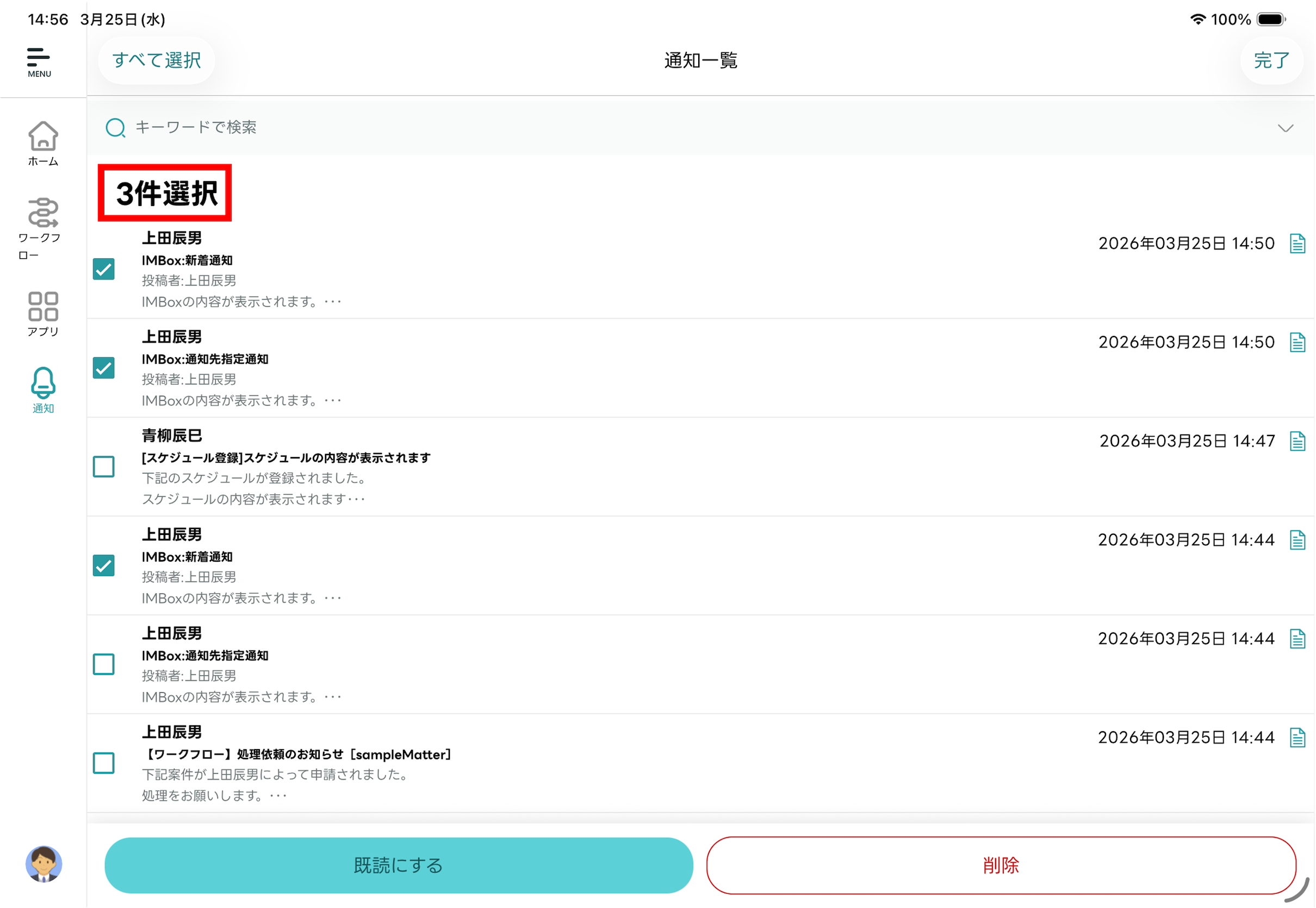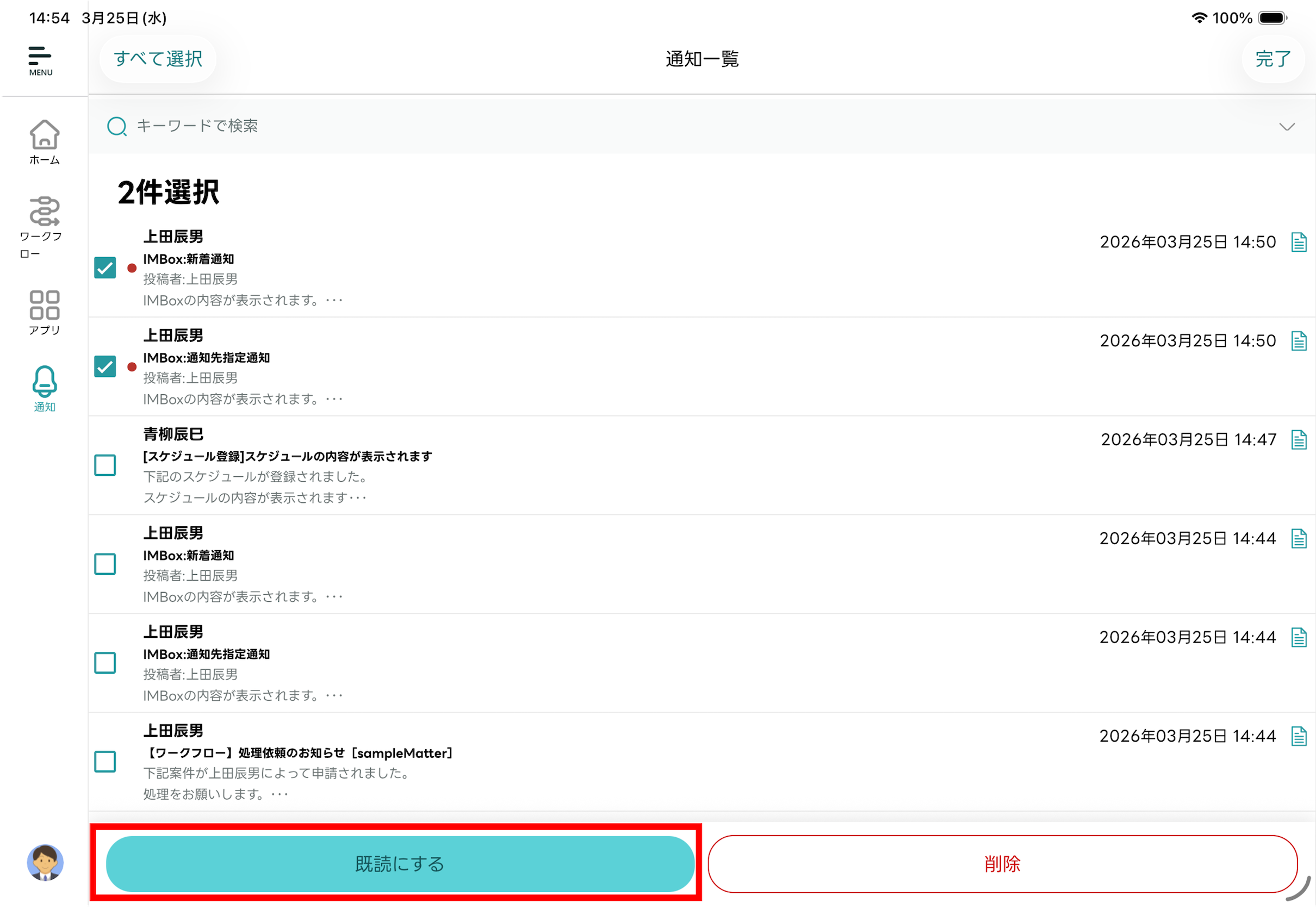 通知メッセージを複数選択して既読化できます。