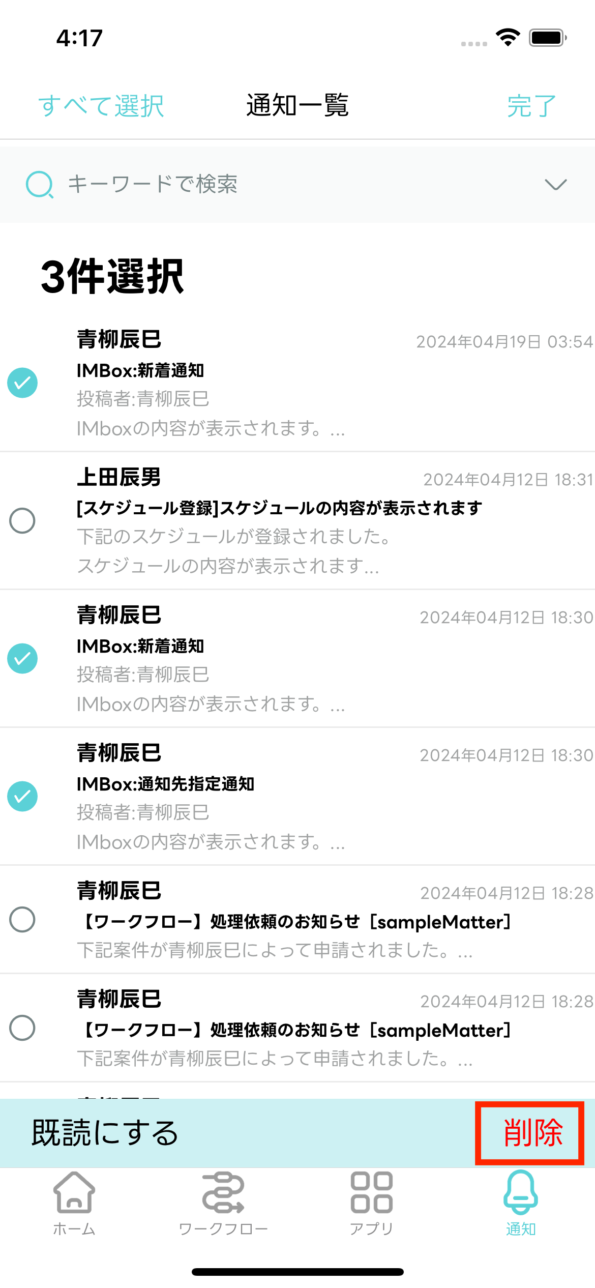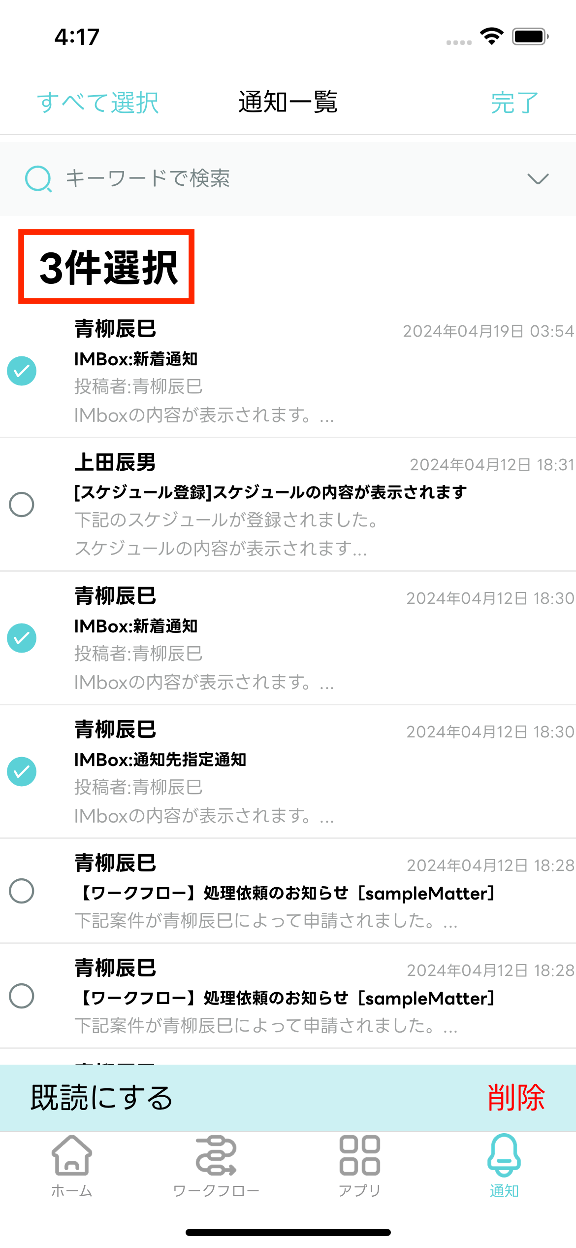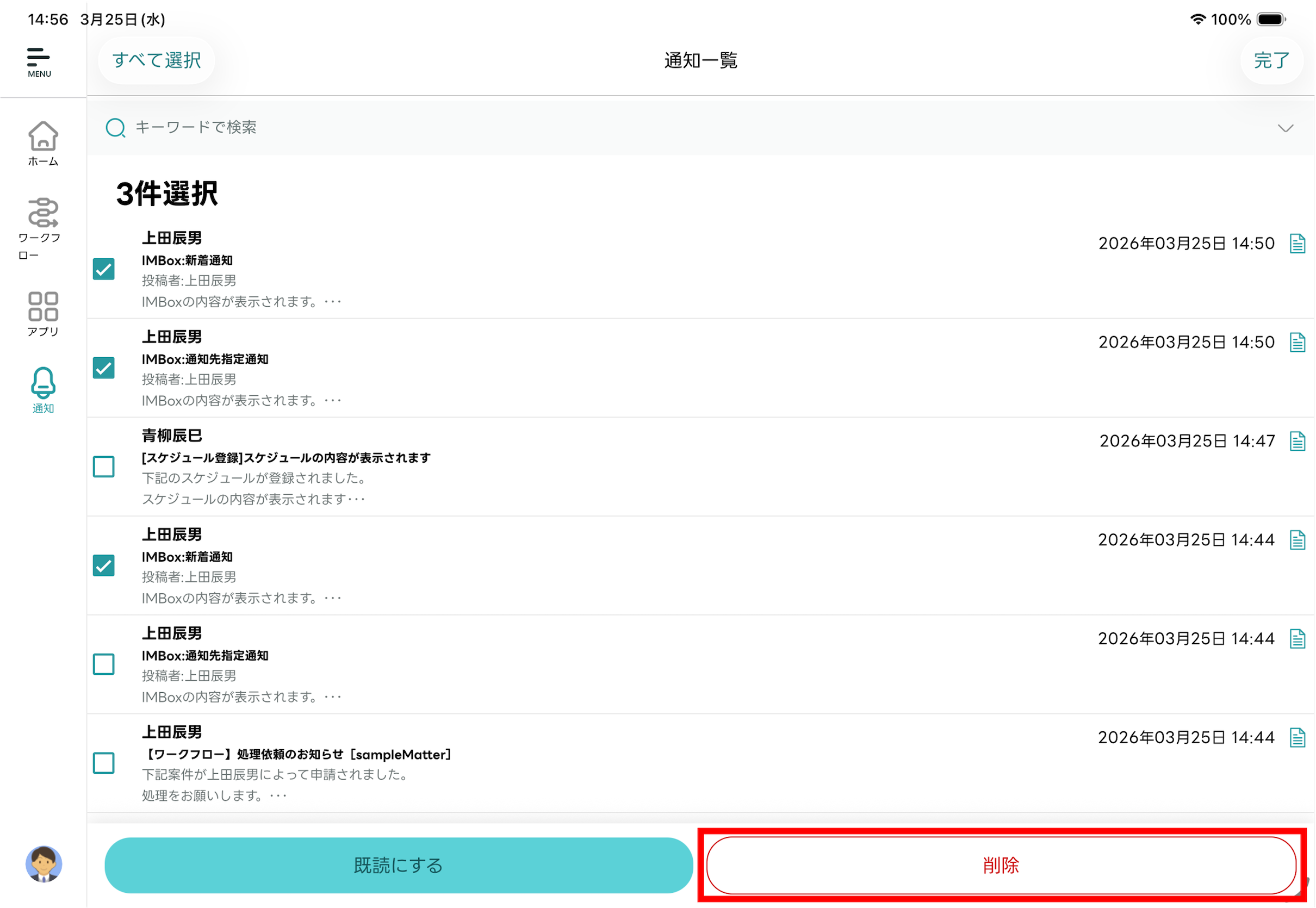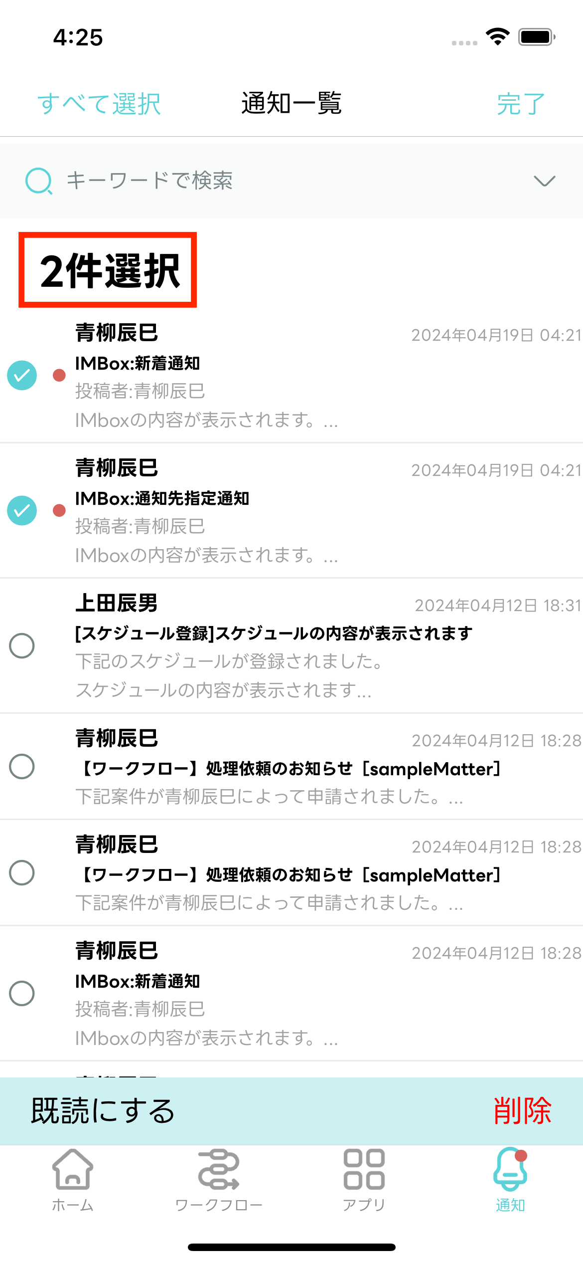 通知メッセージを複数選択して既読化できます。