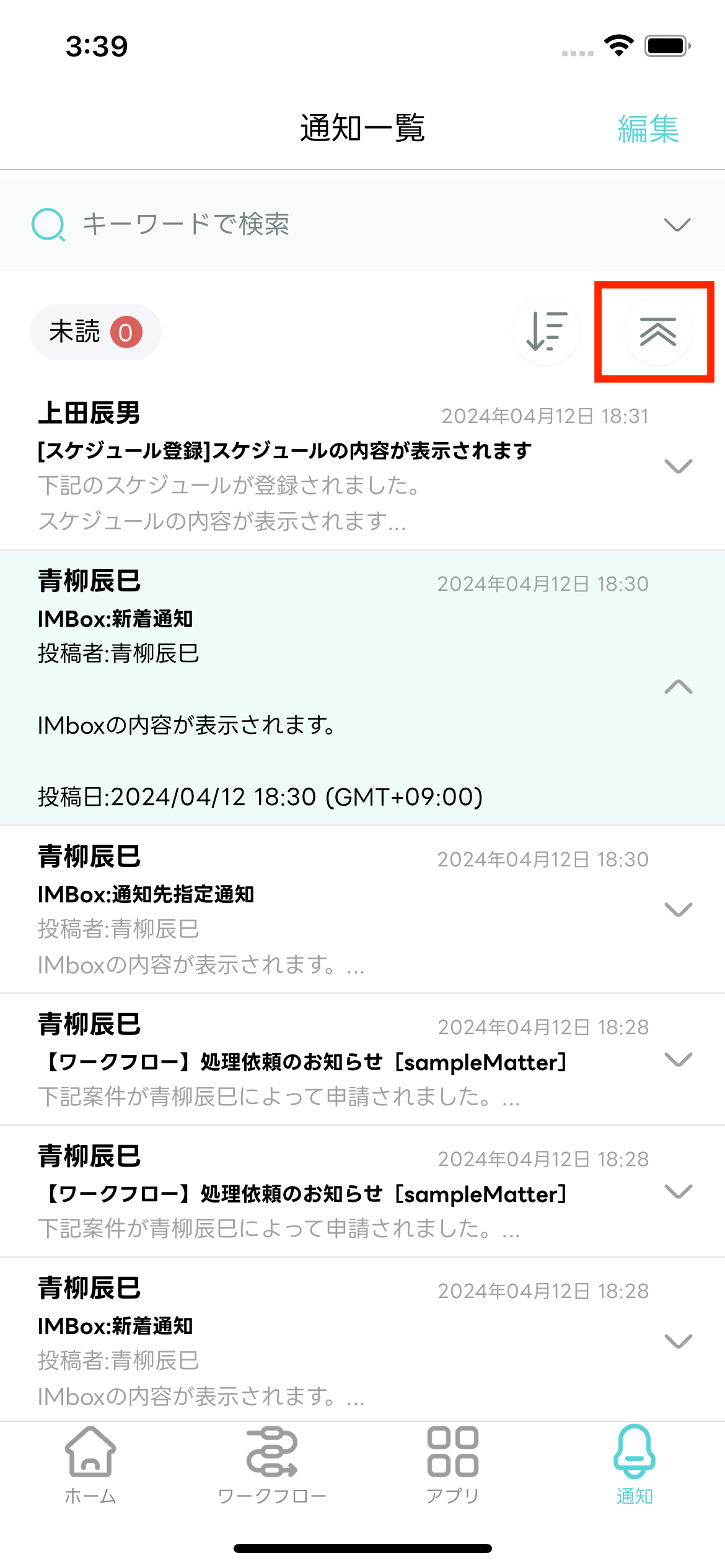 - 通知メッセージの詳細が表示されている状態で、アイコン(下記の赤枠)をタップすると、通知メッセージの詳細が閉じます。