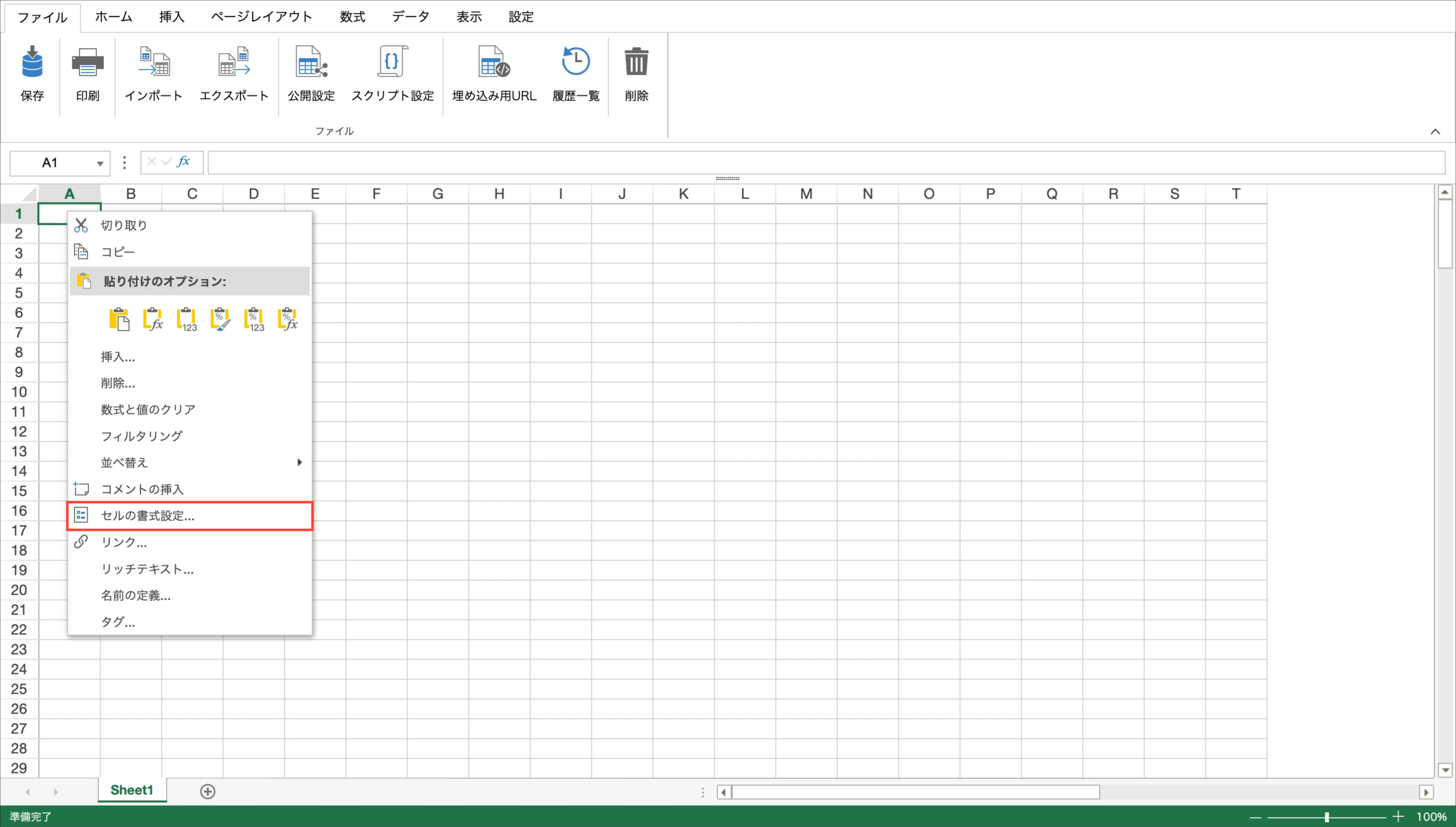 任意のセルを選択して右クリックし、「セルの書式設定」を選択します。