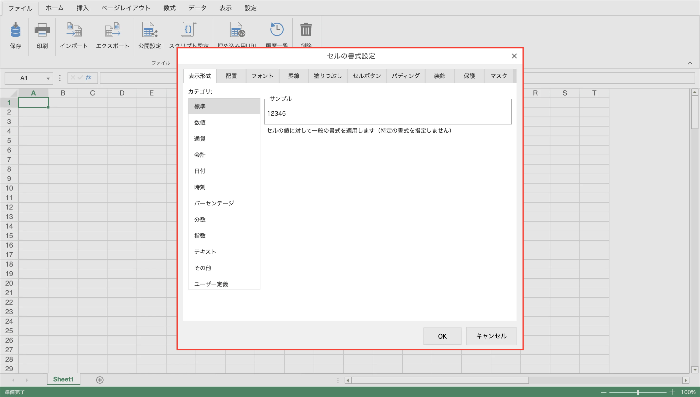 <設定項目> 項目 説明 表示形式 セル内の値に、通貨、パーセンテージ、小数、日付、電話番号、社会保障番号などを設定します。 配置 セル内の文字の配置、表示方法などを設定します。 フォント セル内の文字の書体、スタイルなどを設定します。 罫線 セルの周りの罫線のスタイルを設定します。 塗りつぶし セルの背景色を設定します。 セルボタン セルボタンを設定します。 パディング セル内のスペース、ラベルを設定します。 装飾 セル内の角折り、アイコンを設定します。 保護 ワークシートを保護した際に、セルの編集を許可するかを設定します。 マスク 入力マスクを設定します。