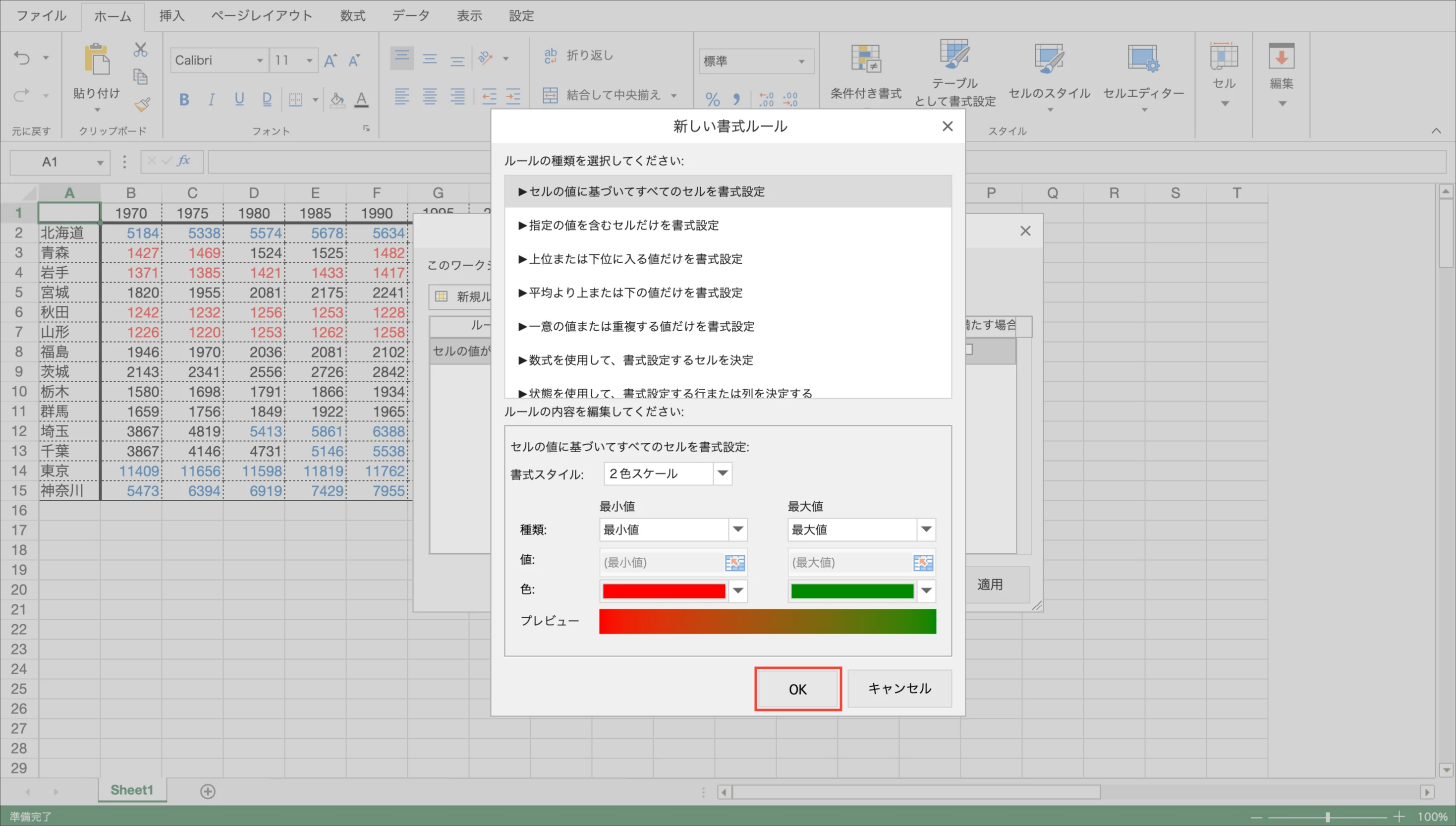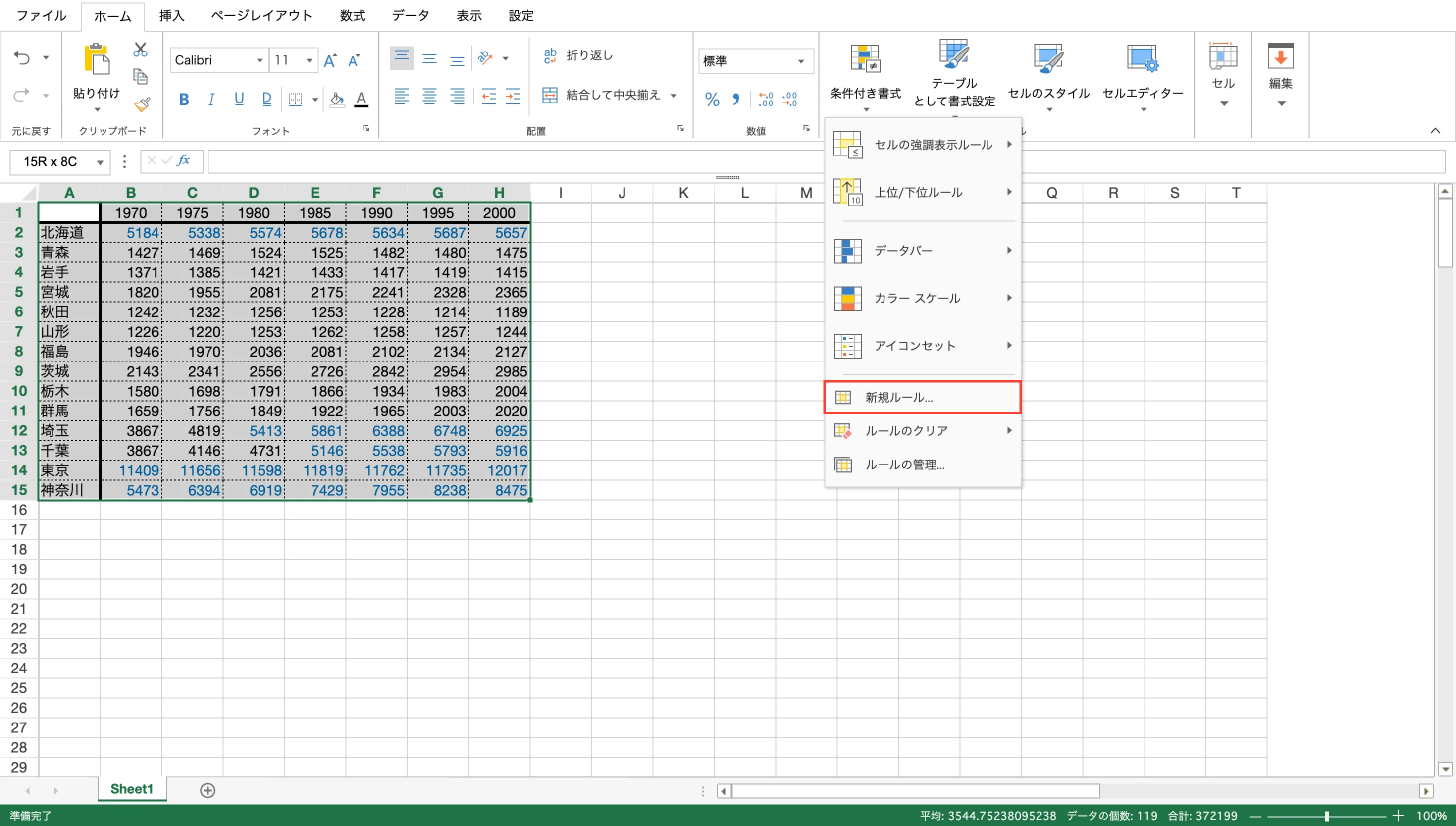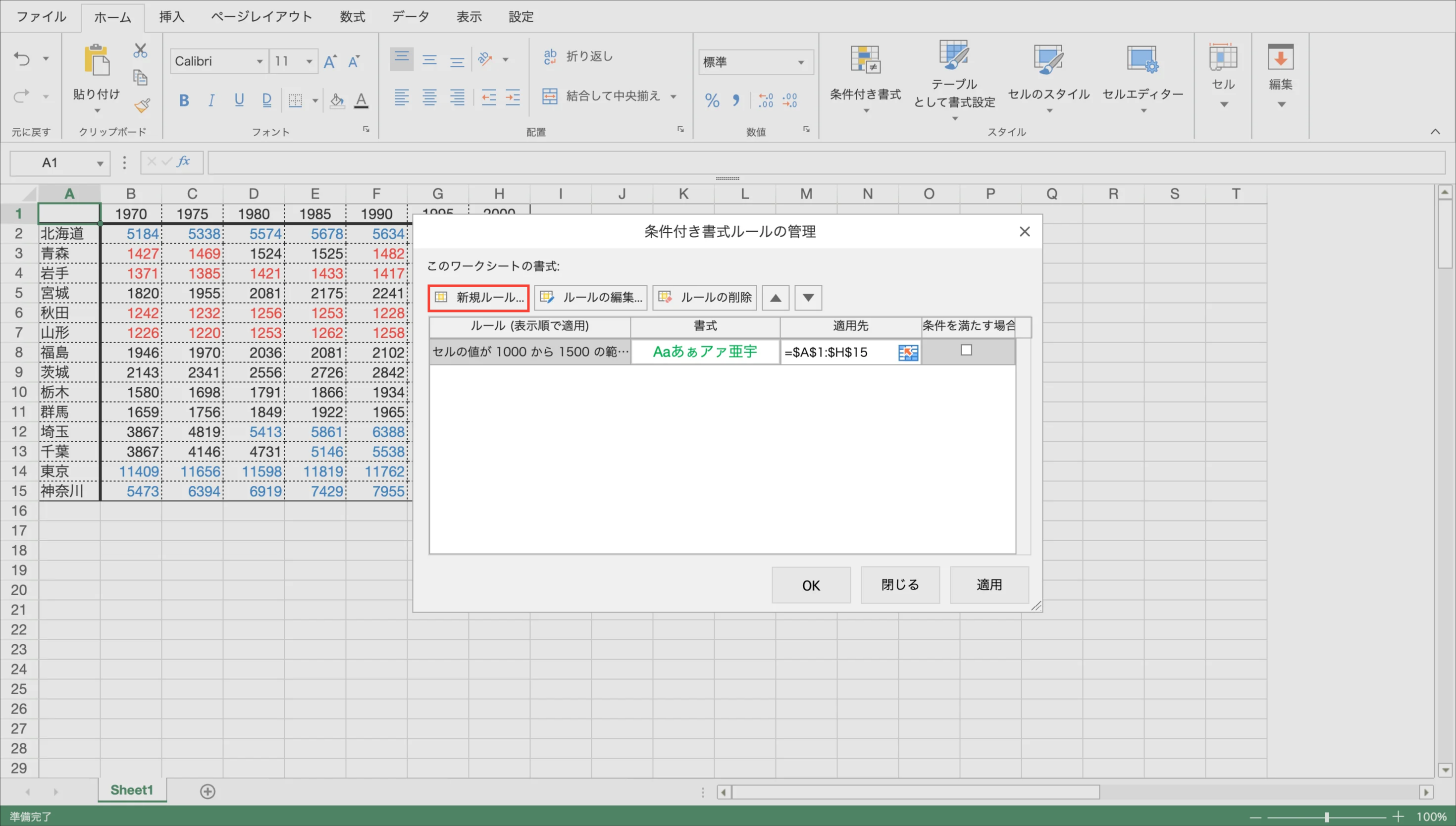 条件付き書式ルールの管理ダイアログより新規ルールボタンをクリックします。