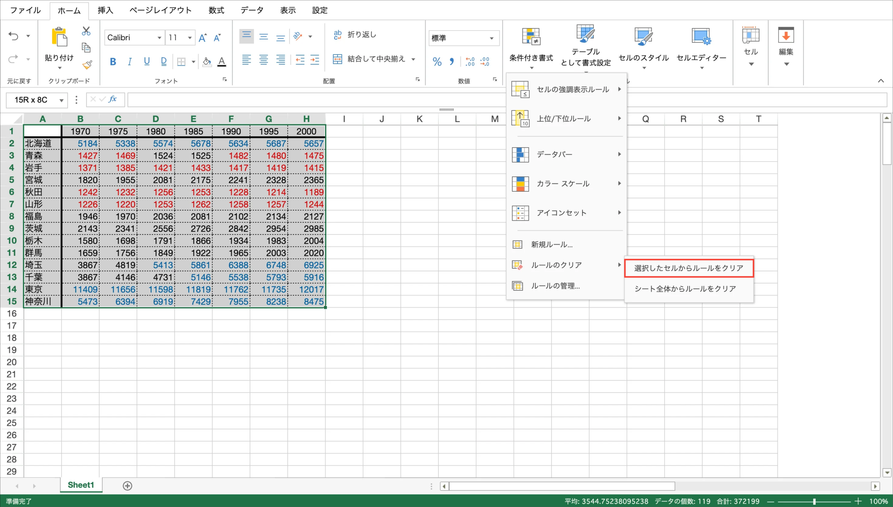 「ルールのクリア」 - 「選択したセルからルールをクリア」をクリックします。