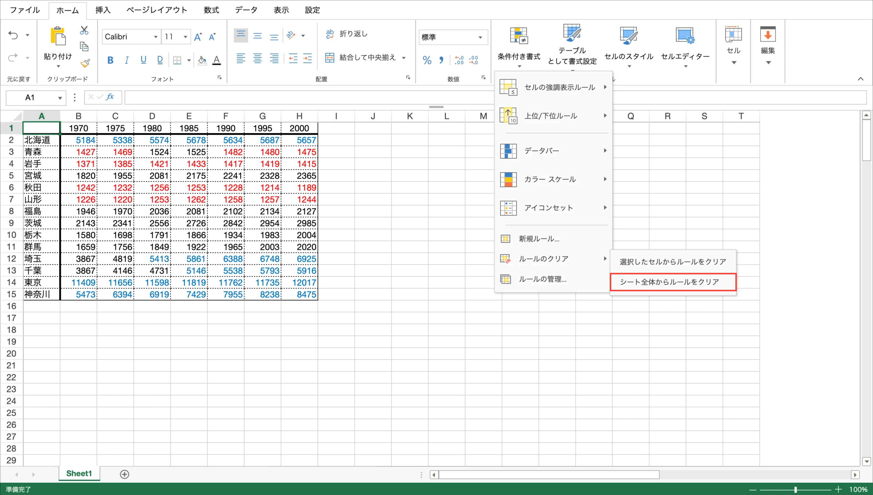 「ルールのクリア」 - 「シート全体からルールをクリア」をクリックします。