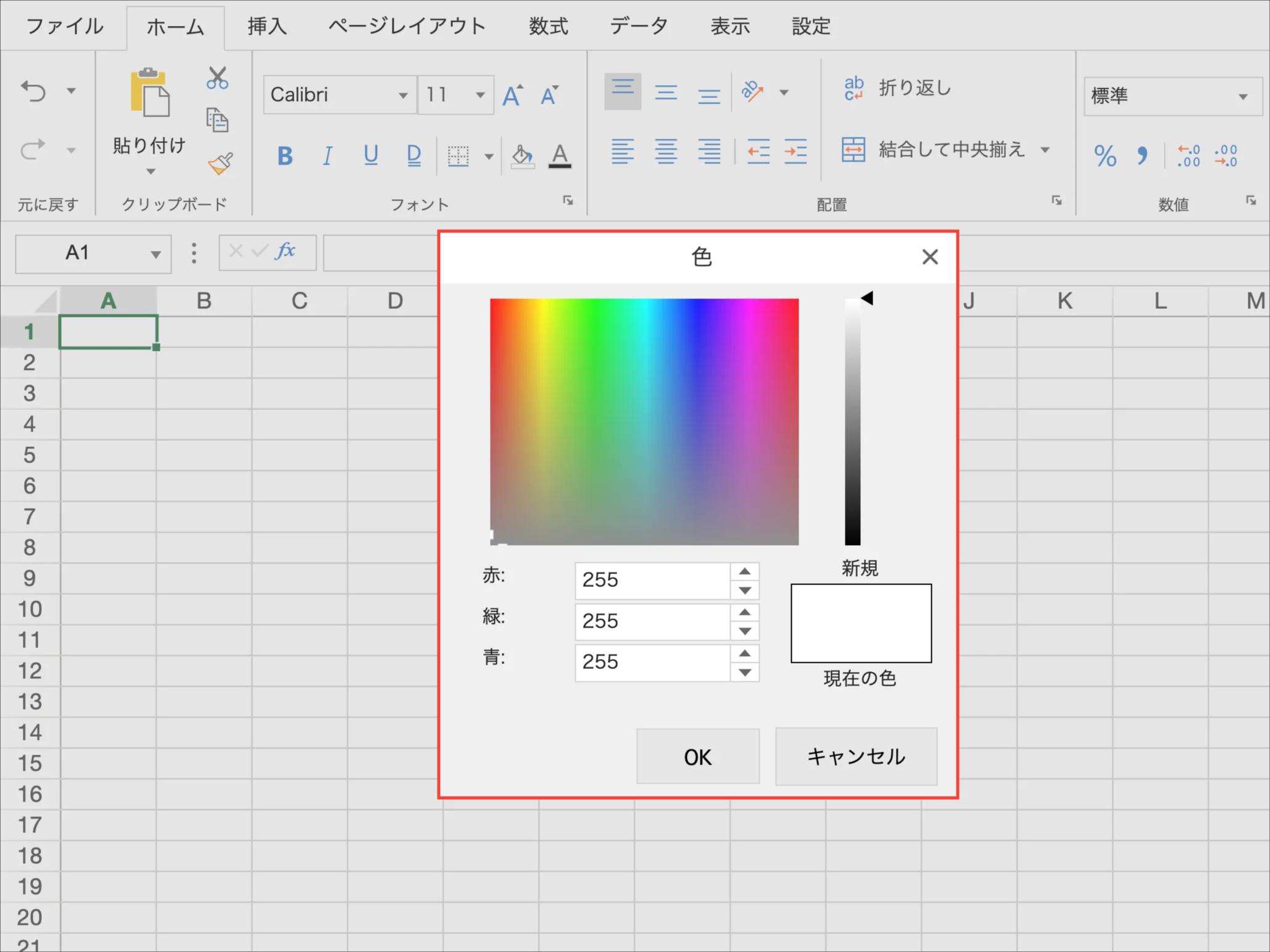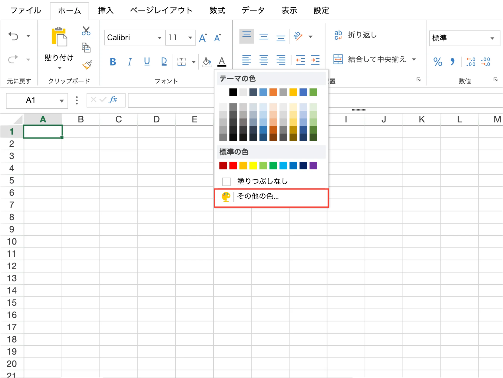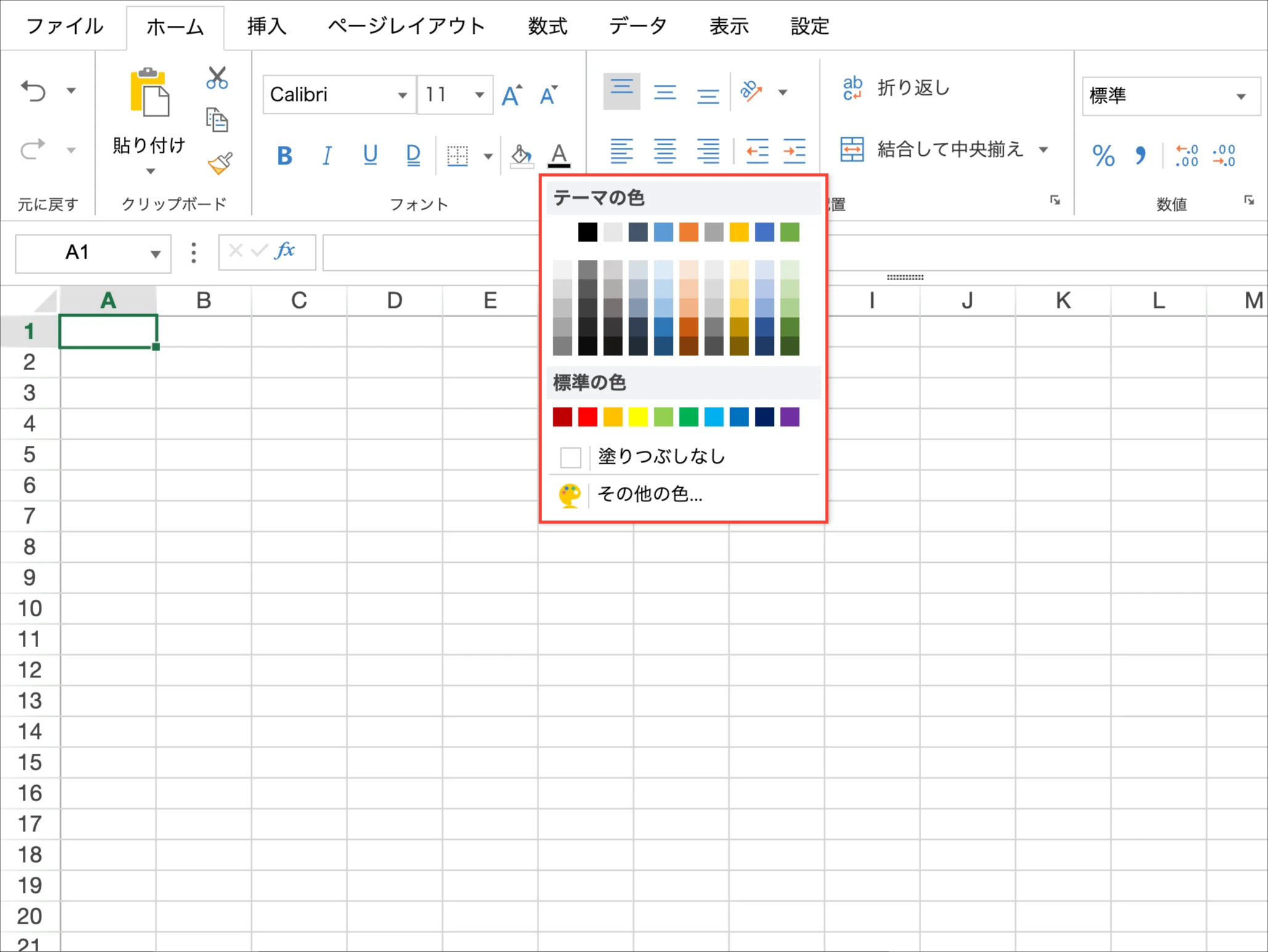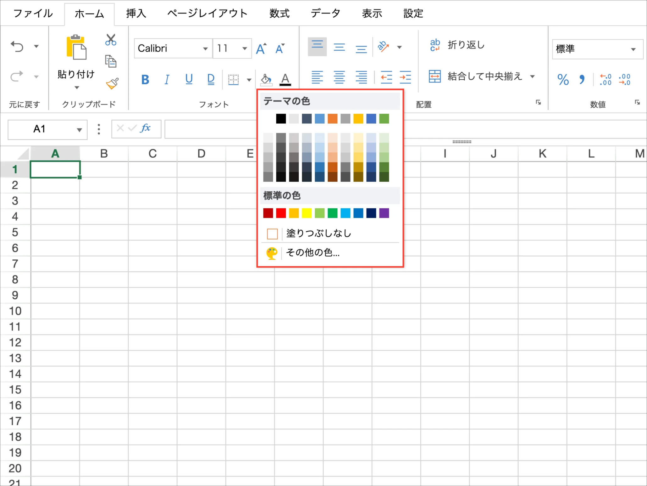 「ホーム」 - 「塗りつぶしの色」アイコンをクリックします。