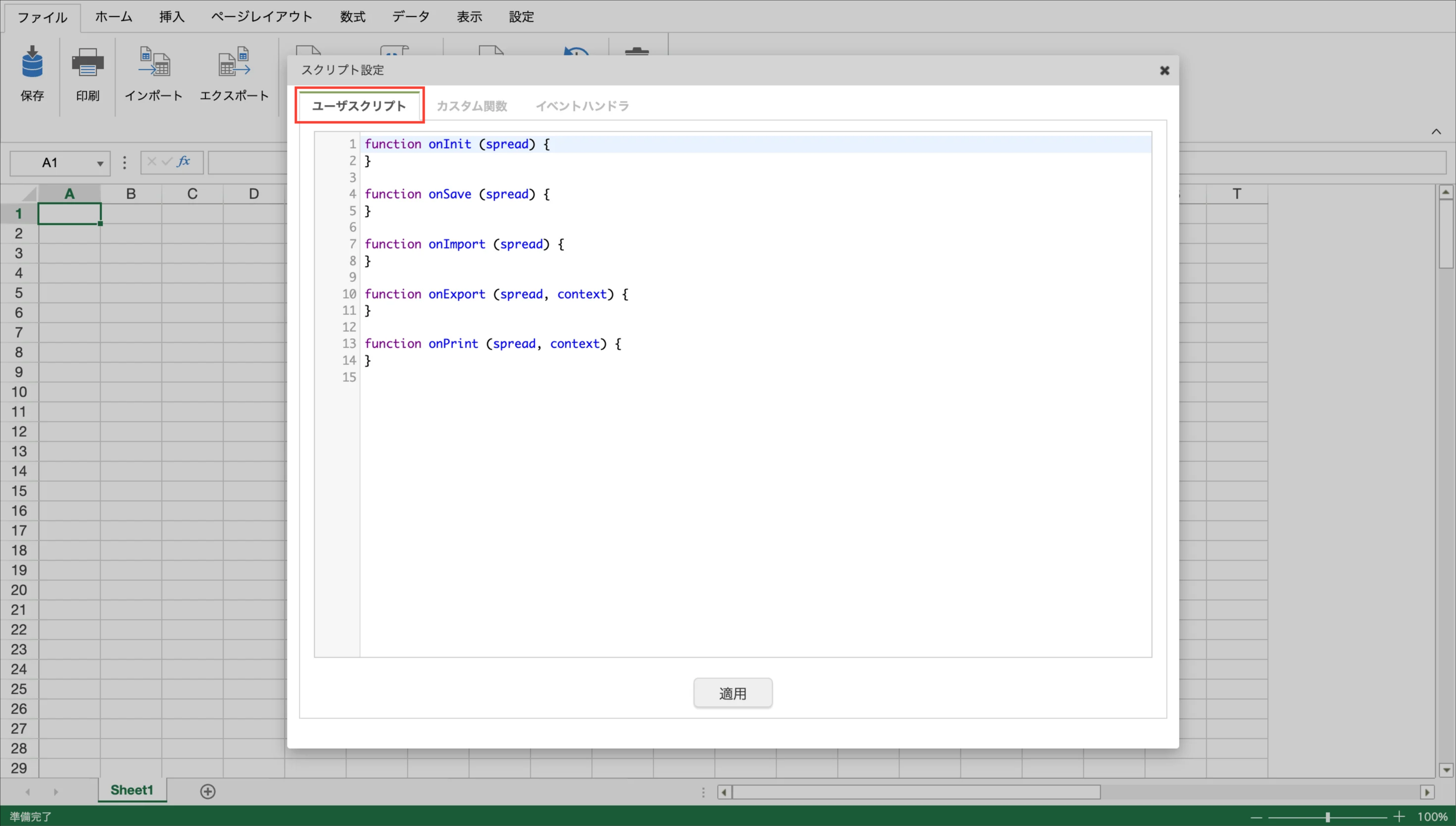 イベント イベント 引数 説明 onInit spread ワークブックを開いた時に実行されるイベントです。ワークブックの読み込みが完了した後に実行されます。onSave spread ワークブックを保存する時に実行されるイベントです。保存処理の前に実行されます。onImport spread ワークブックをインポートする時に実行されるイベントです。インポート処理の後に実行されます。onExport spread, context ワークブックをエクスポートする時に実行されるイベントです。エクスポート処理の前に実行されます。onPrint spread, context ワークブックを印刷する時に実行されるイベントです。印刷処理の前に実行されます。