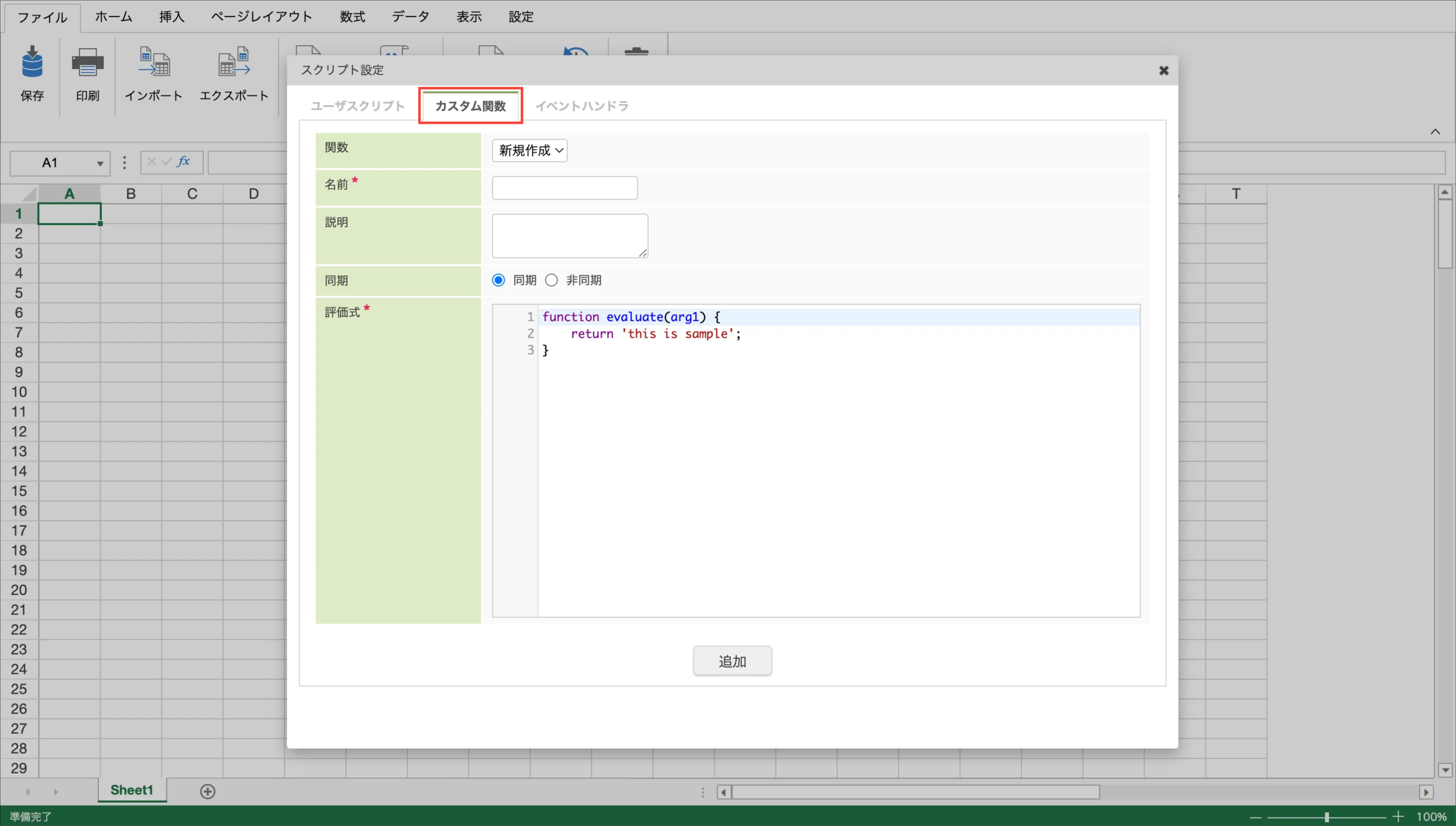 引数 説明 context contextにはAsyncEvaluateContextオブジェクトが渡されます。AsyncEvaluateContextの詳細は以下を参照してください。SpreadJS AsyncEvaluateContextタイプarg1 関数で指定した値が渡されます。複数の引数を利用する場合は、カンマ区切りで引数を増やしてください。