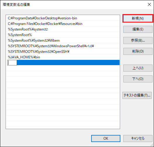 「環境変数名の編集」画面が表示されるので、「新規」をクリックします。