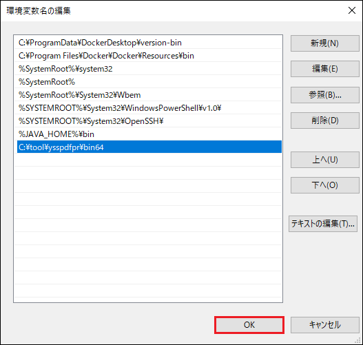 < %PDFPRINT%/bin64 >のパスを入力し、「OK」をクリックします。