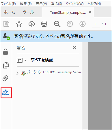 タイムスタンプを付与したPDFファイルを Adobe Acrobat Reader 、または、 Adobe Acrobat で開きます。