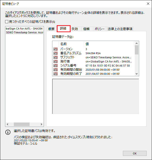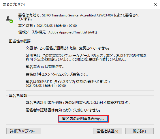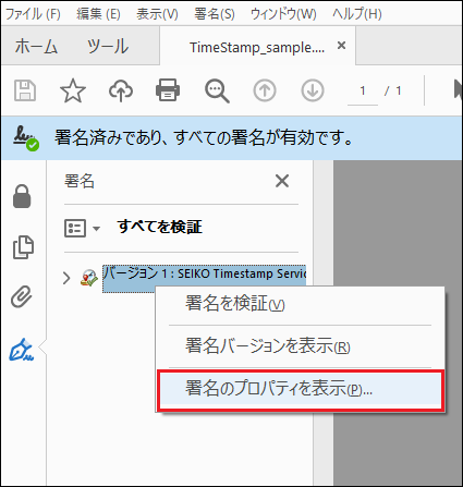 「SEIKO TimeStamp...」-「右クリック」-「署名のプロパティを表示」をクリックします。