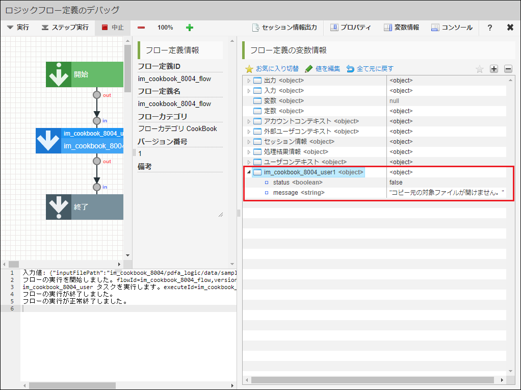 PDFの変換処理に失敗した場合は、デバッグ実行時のユーザ定義の返却値「status」、および、「message」を確認してください。